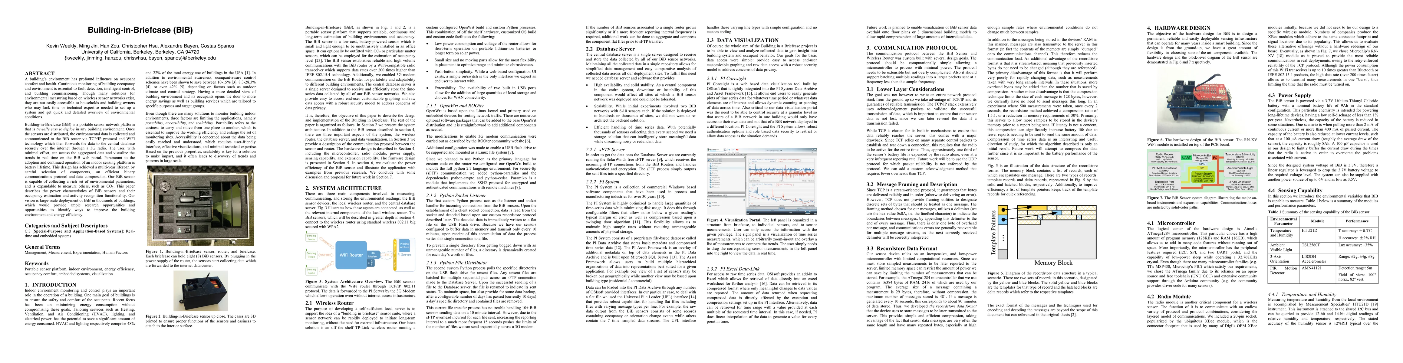 The Building-in-Briefcase (BiB) platform is a portable sensor network designed for easy deployment in any building to monitor environmental conditions. It collects data via sensors, transmits it securely over the internet, and allows users to visualize trends in real time, all while maintaining a long battery life through efficient design and protocols.