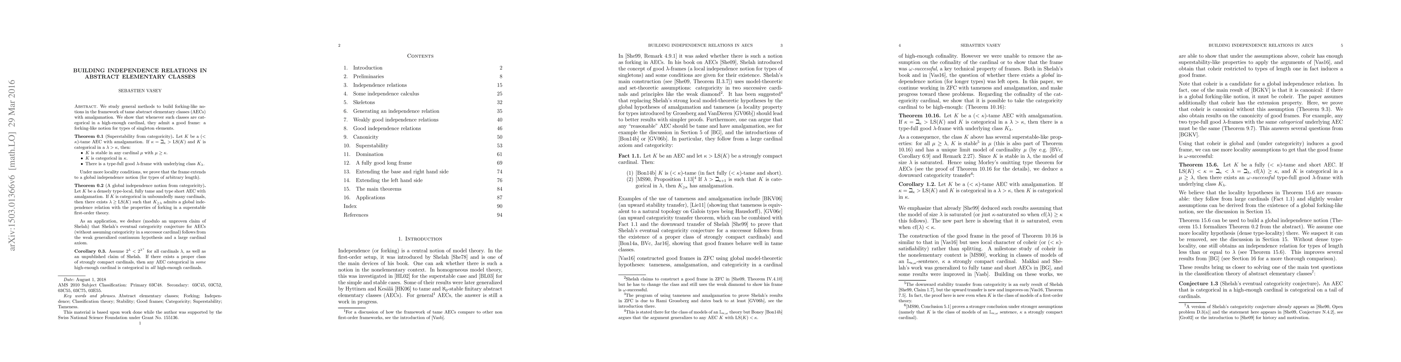We study general methods to build forking-like notions in the framework of tame abstract elementary classes (AECs) with amalgamation. We show that whenever such classes are categorical in a high-enough cardinal, they admit a good frame: a forking-like notion for types of singleton elements. $\mathbf{Theorem}$ (Superstability from categoricity) Let $K$ be a $(<\kappa)$-tame AEC with amalgamation. If $\kappa = \beth_\kappa > \text{LS} (K)$ and $K$ is categorical in a $\lambda > \kappa$, then: * $K$ is stable in all cardinals $\ge \kappa$. * $K$ is categorical in $\kappa$. * There is a type-full good $\lambda$-frame with underlying class $K_\lambda$. Under more locality conditions, we prove that the frame extends to a global independence notion (for types of arbitrary length). $\mathbf{Theorem}$ (A global independence notion from categoricity) Let $K$ be a densely type-local, fully tame and type short AEC with amalgamation. If $K$ is categorical in unboundedly many cardinals, then there exists $\lambda \ge \text{LS} (K)$ such that $K_{\ge \lambda}$ admits a global independence relation with the properties of forking in a superstable first-order theory. As an application, we deduce (modulo an unproven claim of Shelah) that Shelah's eventual categoricity conjecture for AECs (without assuming categoricity in a successor cardinal) follows from the weak generalized continuum hypothesis and a large cardinal axiom. $\textbf{Corollary}$ Assume $2^{\lambda} < 2^{\lambda^+}$ for all cardinals $\lambda$, as well as an unpublished claim of Shelah. If there exists a proper class of strongly compact cardinals, then any AEC categorical in some high-enough cardinal is categorical in all high-enough cardinals.