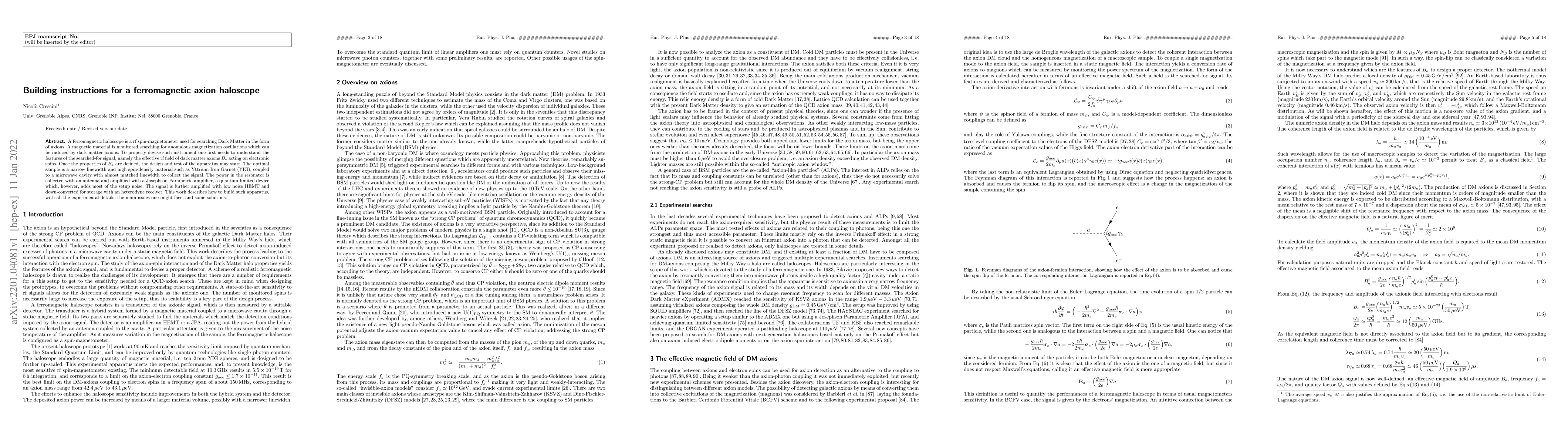 A ferromagnetic haloscope is a rf spin-magnetometer used for searching Dark Matter in the form of axions. A magnetic material is monitored searching for anomalous magnetization oscillations which can be induced by dark matter axions. To properly devise such instrument one first needs to understand the features of the searched-for signal, namely the effective rf field of dark matter axions $B_a$ acting on electronic spins. Once the properties of $B_a$ are defined, the design and test of the apparatus may start. The optimal sample is a narrow linewidth and high spin-density material such as Yttrium Iron Garnet (YIG), coupled to a microwave cavity with almost matched linewidth to collect the signal. The power in the resonator is collected with an antenna and amplified with a Josephson Parametric amplifier, a quantum-limited device which, however, adds most of the setup noise. The signal is further amplified with low noise HEMT and down-converted for storage with an heterodyne receiver. This work describes how to build such apparatus, with all the experimental details, the main issues one might face, and some solutions.