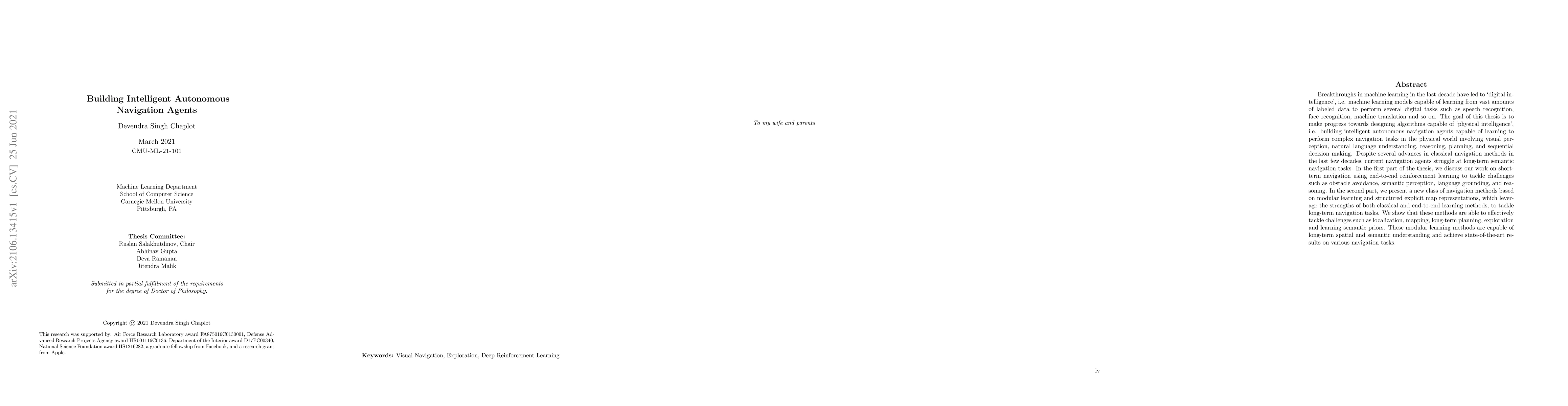 This paper explores the development of intelligent autonomous navigation agents using machine learning, focusing on both short-term obstacle avoidance and long-term semantic navigation tasks. The authors propose modular learning methods that combine classical and end-to-end learning to achieve state-of-the-art results in complex navigation scenarios.