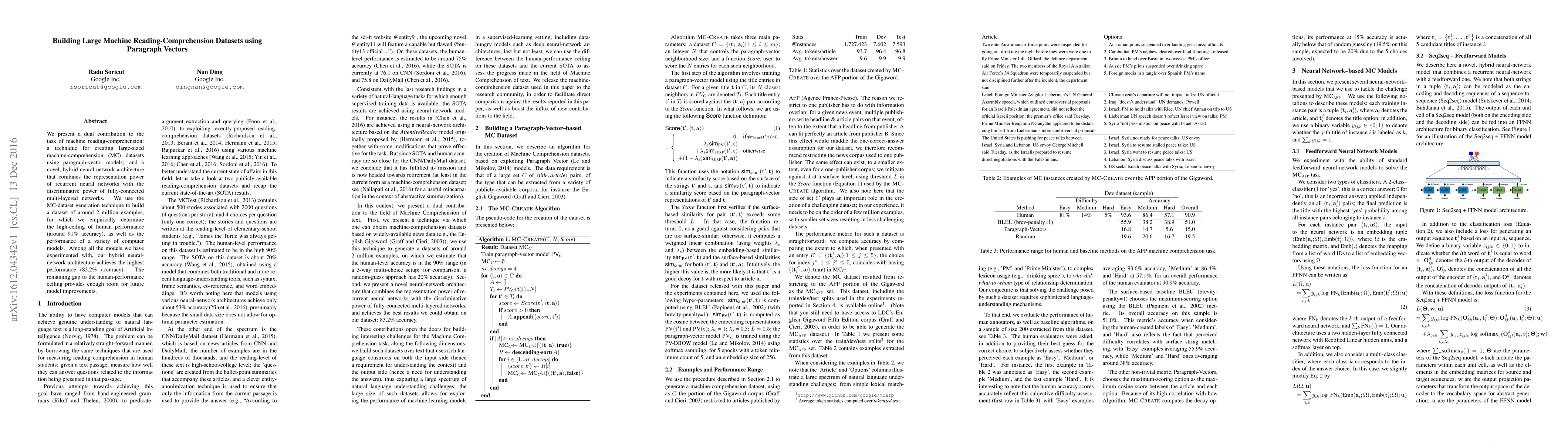 This paper introduces a method for generating large machine reading-comprehension datasets using paragraph-vector models, alongside a hybrid neural-network architecture that combines RNNs and fully-connected networks for improved performance. The authors achieve 83.2% accuracy, leaving room for future enhancements to close the gap to the human performance ceiling of 91%.
