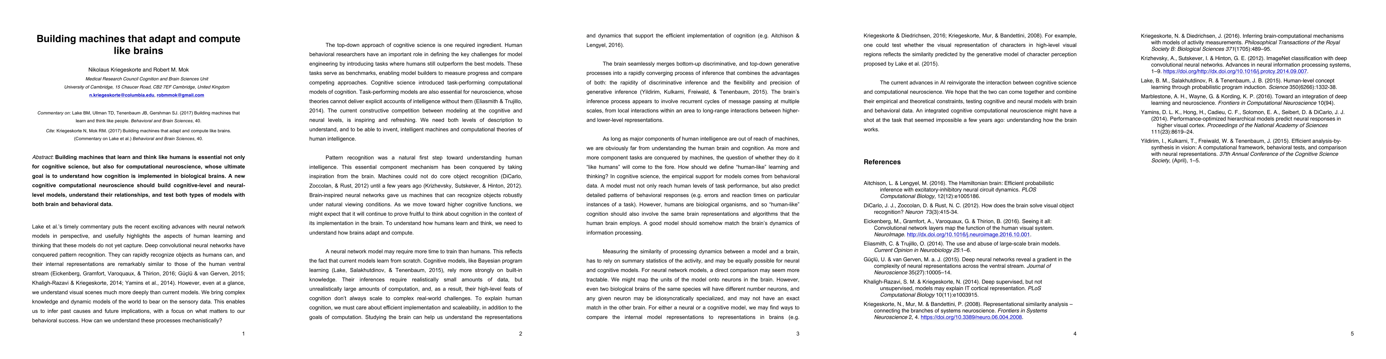 Building machines that learn and think like humans is essential not only for cognitive science, but also for computational neuroscience, whose ultimate goal is to understand how cognition is implemented in biological brains. A new cognitive computational neuroscience should build cognitive-level and neural- level models, understand their relationships, and test both types of models with both brain and behavioral data.