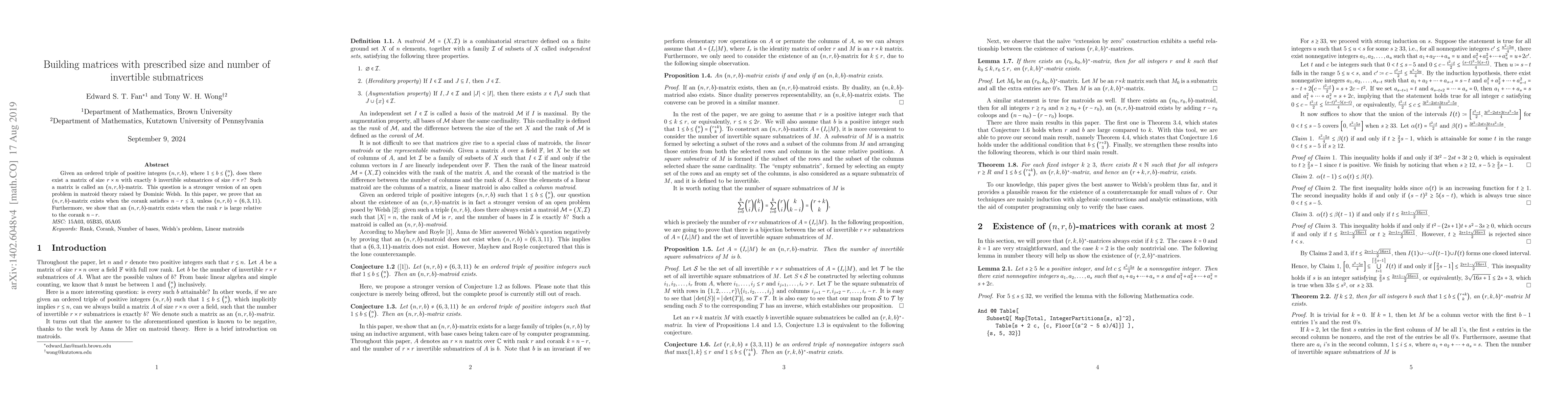 Given an ordered triple of positive integers $(n,r,b)$, where $1\leq b\leq\binom{n}{r}$, does there exist a matrix of size $r\times n$ with exactly $b$ invertible submatrices of size $r\times r$? Such a matrix is called an $(n,r,b)$-matrix. This question is a stronger version of an open problem in matroid theory raised by Dominic Welsh. In this paper, we prove that an $(n,r,b)$-matrix exists when the corank satisfies $n-r\leq3$, unless $(n,r,b)=(6,3,11)$. Furthermore, we show that an $(n,r,b)$-matrix exists when the rank $r$ is large relative to the corank $n-r$.