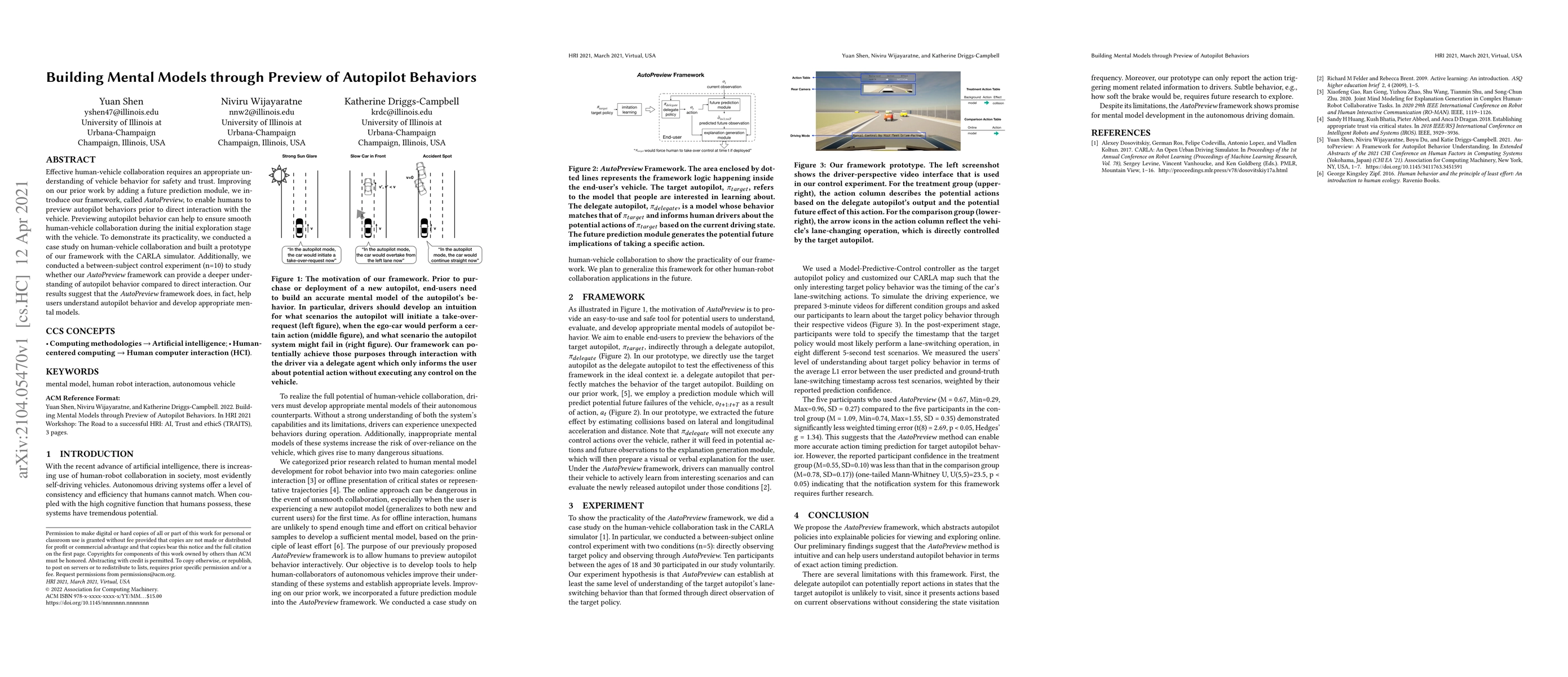 The AutoPreview framework, integrating a future prediction module, allows humans to preview autopilot vehicle behaviors before interaction, enhancing understanding and trust. A study with 10 participants using a CARLA simulator prototype confirmed that AutoPreview aids in building appropriate mental models of autopilot behavior.
