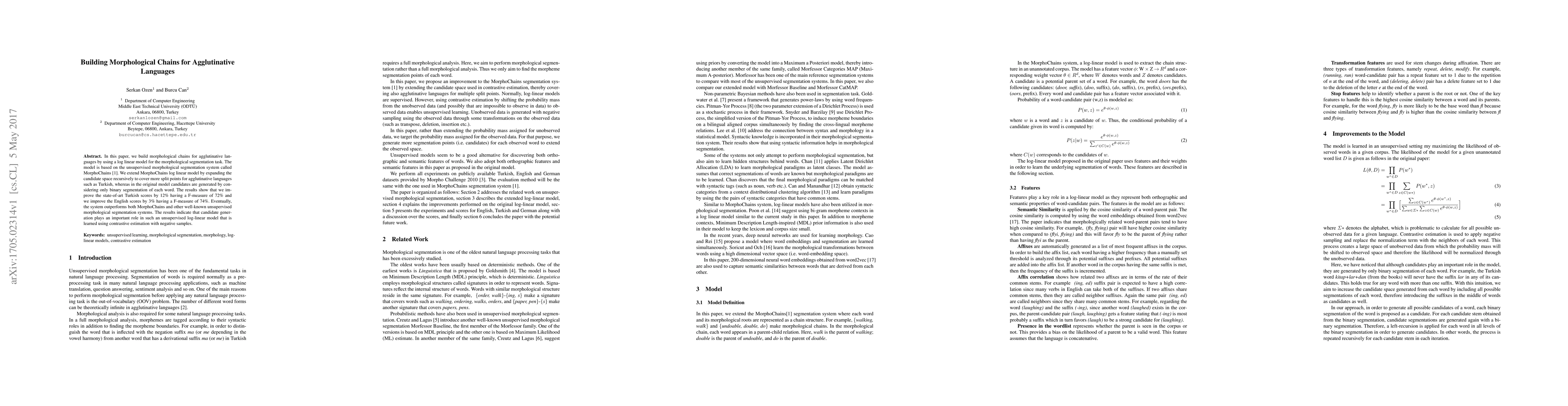 In this paper, we build morphological chains for agglutinative languages by using a log-linear model for the morphological segmentation task. The model is based on the unsupervised morphological segmentation system called MorphoChains. We extend MorphoChains log linear model by expanding the candidate space recursively to cover more split points for agglutinative languages such as Turkish, whereas in the original model candidates are generated by considering only binary segmentation of each word. The results show that we improve the state-of-art Turkish scores by 12% having a F-measure of 72% and we improve the English scores by 3% having a F-measure of 74%. Eventually, the system outperforms both MorphoChains and other well-known unsupervised morphological segmentation systems. The results indicate that candidate generation plays an important role in such an unsupervised log-linear model that is learned using contrastive estimation with negative samples.