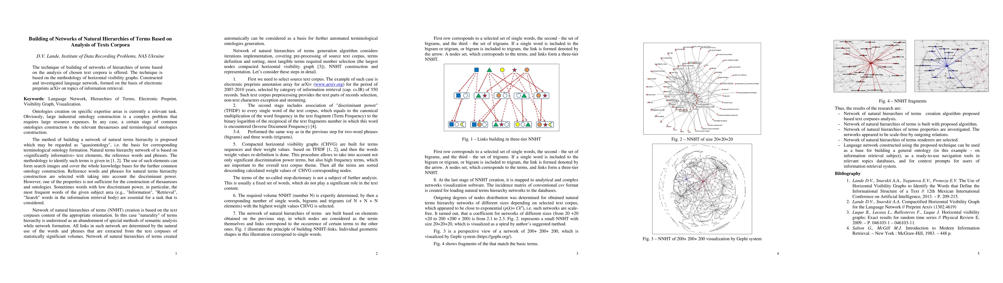The technique of building of networks of hierarchies of terms based on the analysis of chosen text corpora is offered. The technique is based on the methodology of horizontal visibility graphs. Constructed and investigated language network, formed on the basis of electronic preprints arXiv on topics of information retrieval.