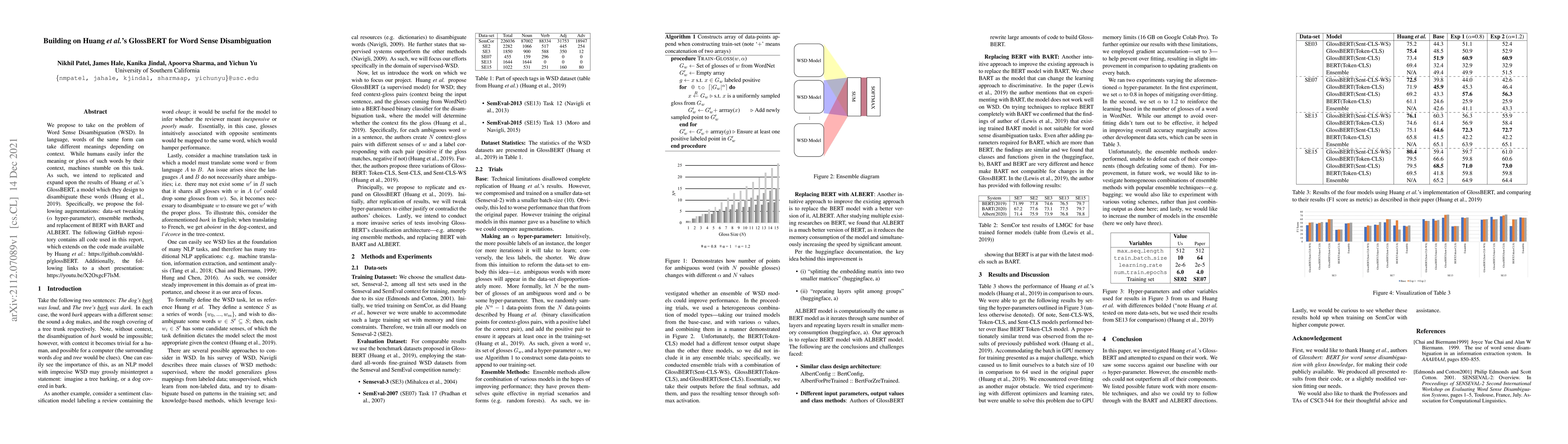 We propose to take on the problem ofWord Sense Disambiguation (WSD). In language, words of the same form can take different meanings depending on context. While humans easily infer the meaning or gloss of such words by their context, machines stumble on this task.As such, we intend to replicated and expand upon the results of Huang et al.GlossBERT, a model which they design to disambiguate these words (Huang et al.,2019). Specifically, we propose the following augmentations: data-set tweaking(alpha hyper-parameter), ensemble methods, and replacement of BERT with BART andALBERT. The following GitHub repository contains all code used in this report, which extends on the code made available by Huang et al.