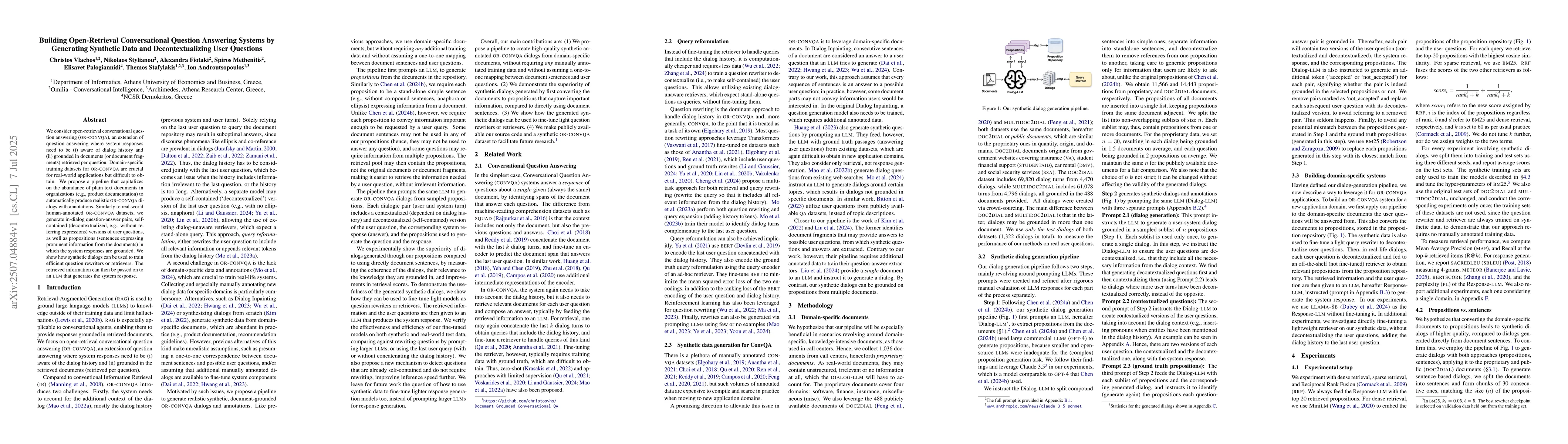 We consider open-retrieval conversational question answering (OR-CONVQA), an extension of question answering where system responses need to be (i) aware of dialog history and (ii) grounded in documents (or document fragments) retrieved per question. Domain-specific OR-CONVQA training datasets are crucial for real-world applications, but hard to obtain. We propose a pipeline that capitalizes on the abundance of plain text documents in organizations (e.g., product documentation) to automatically produce realistic OR-CONVQA dialogs with annotations. Similarly to real-world humanannotated OR-CONVQA datasets, we generate in-dialog question-answer pairs, self-contained (decontextualized, e.g., no referring expressions) versions of user questions, and propositions (sentences expressing prominent information from the documents) the system responses are grounded in. We show how the synthetic dialogs can be used to train efficient question rewriters that decontextualize user questions, allowing existing dialog-unaware retrievers to be utilized. The retrieved information and the decontextualized question are then passed on to an LLM that generates the system's response.