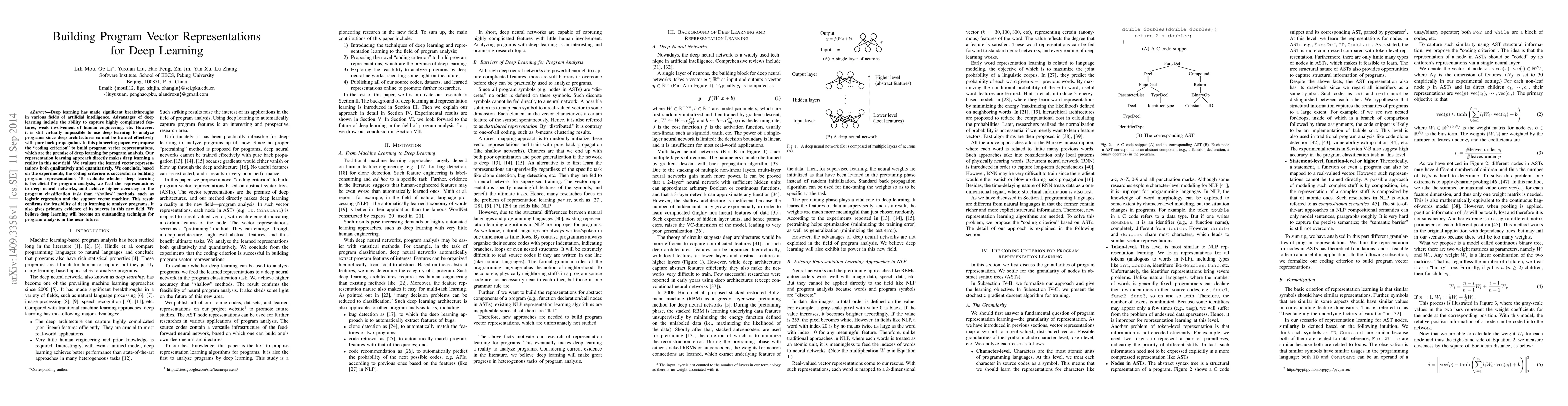 This paper proposes a "coding criterion" to create vector representations for program analysis, enabling effective deep learning. Experiments show that these representations, when used in deep neural networks, outperform traditional "shallow" methods, indicating deep learning's potential for program analysis.