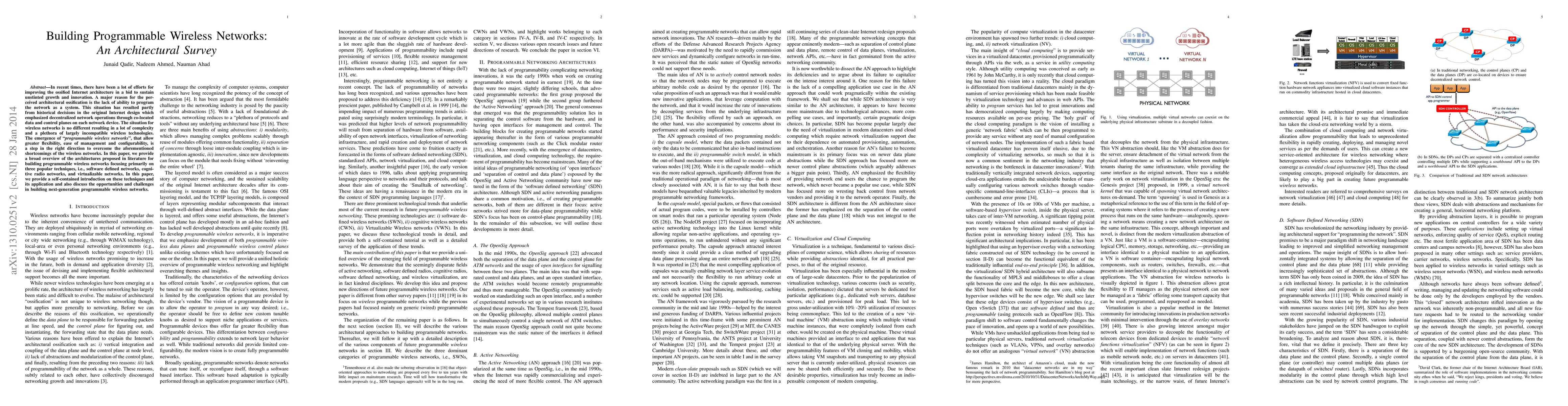 This paper surveys architectures for programmable wireless networks, exploring software defined networks, cognitive radio networks, and virtualized networks to improve flexibility and management in wireless networks. It identifies opportunities, challenges, and future research directions for building next-generation programmable wireless networks.