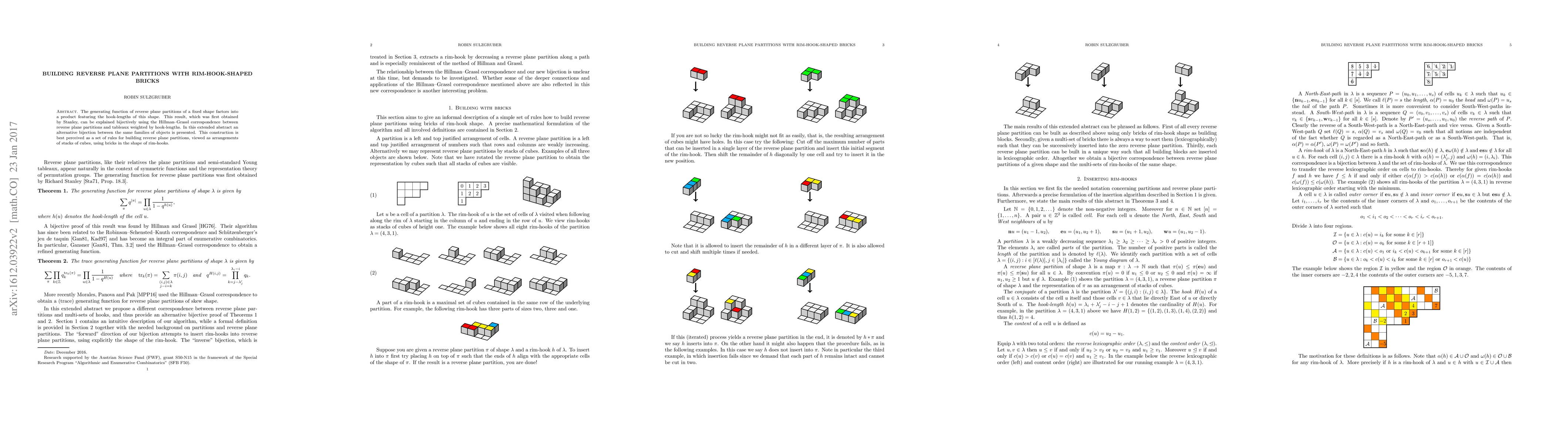 This paper presents an alternative bijection for constructing reverse plane partitions using rim-hook-shaped bricks, offering a new perspective on the Hillman-Grassl correspondence and the generating function factorization based on hook-lengths. The method provides a set of rules for building these partitions as arrangements of cube stacks.