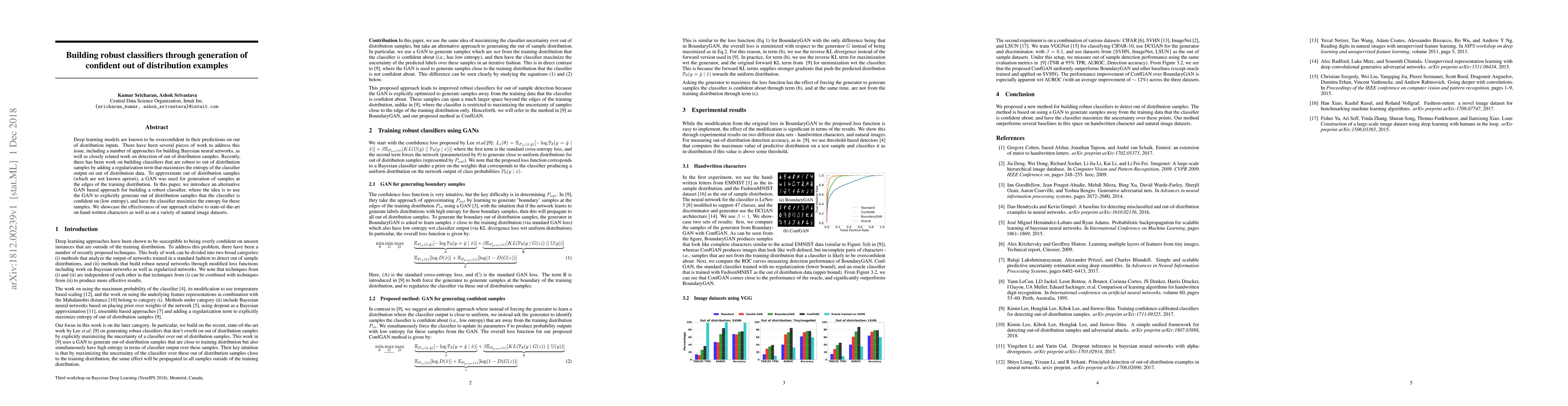 This paper proposes a GAN-based method to generate confident out-of-distribution examples for training robust classifiers, which then maximize entropy for these samples to improve robustness. The approach is shown to outperform state-of-the-art methods on handwritten characters and natural image datasets.