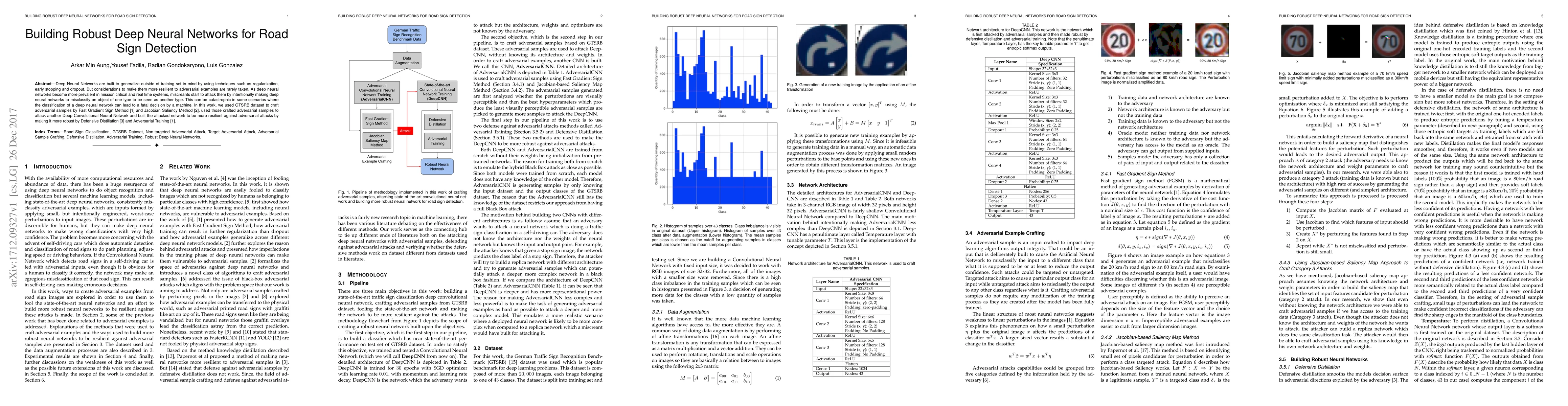 This paper explores techniques to enhance the robustness of Deep Convolutional Neural Networks for road sign detection against adversarial attacks. It employs Defensive Distillation and Adversarial Training to build a more resilient network, using adversarial samples crafted from the GTSRB dataset via the Fast Gradient Sign Method and Jacobian Saliency Method.