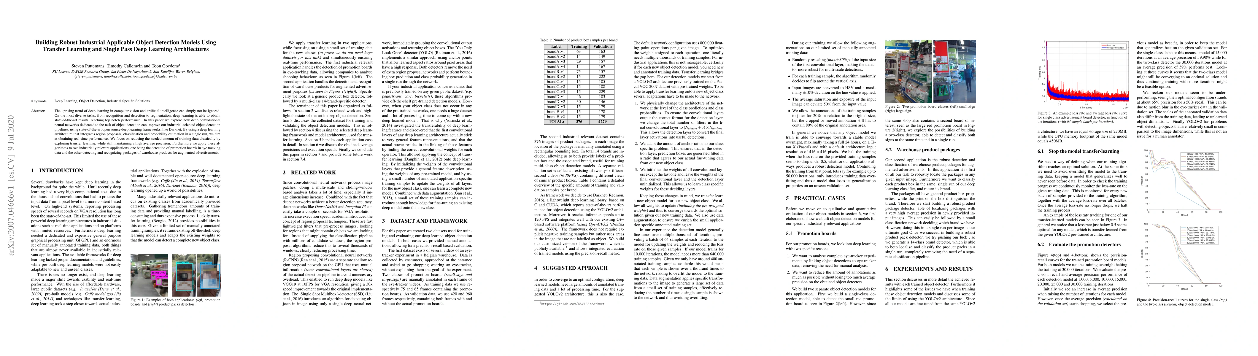 This paper investigates the use of transfer learning and single-pass deep learning architectures to build robust industrial object detection models, achieving real-time performance with minimal training data. It applies these methods to detect promotion boards and warehouse packages, demonstrating high average precision.
