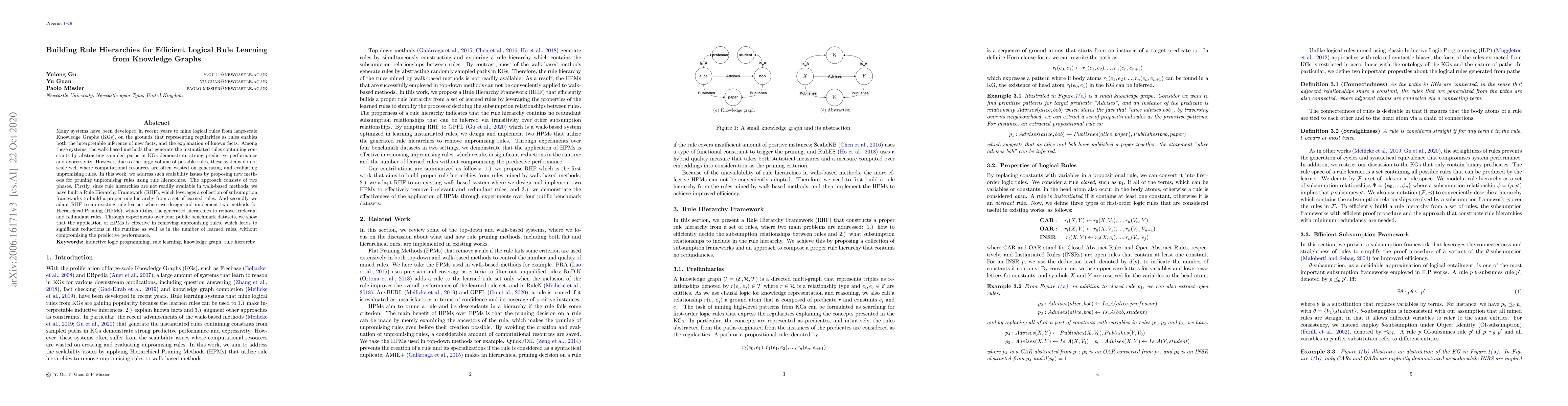 This paper proposes methods for building rule hierarchies to efficiently prune unpromising rules in logical rule learning from Knowledge Graphs. It introduces a Rule Hierarchy Framework (RHF) and Hierarchical Pruning Methods (HPMs) that significantly reduce runtime and rule count while maintaining predictive performance, demonstrated through experiments on four public datasets.