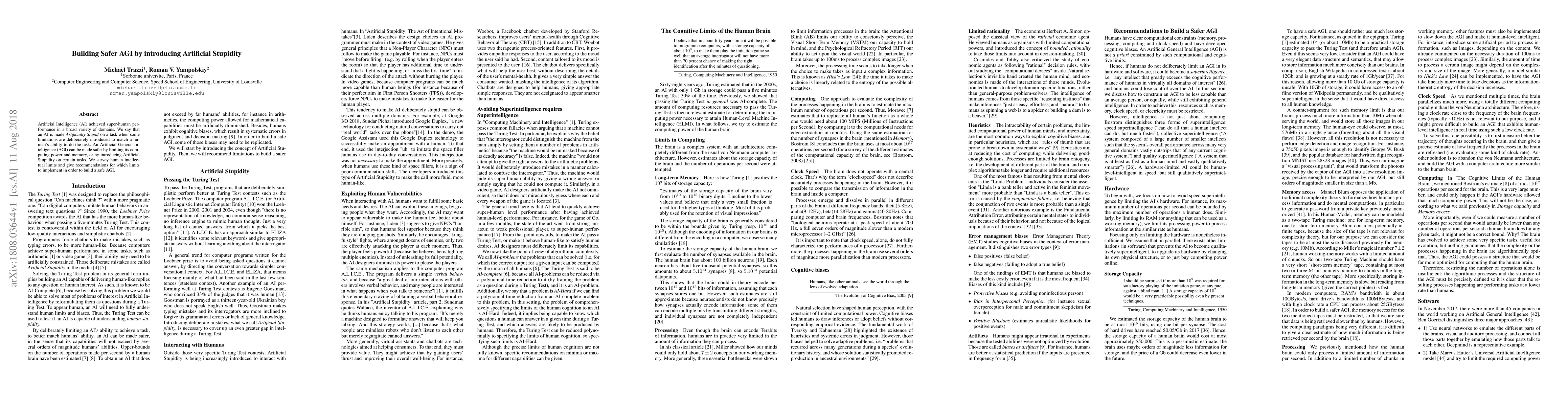 This paper explores the concept of Artificial Stupidity to enhance the safety of Artificial General Intelligence (AGI) by deliberately introducing limitations to match human capabilities. It surveys human intellectual limits and provides recommendations for implementing these limits to create a safer AGI.
