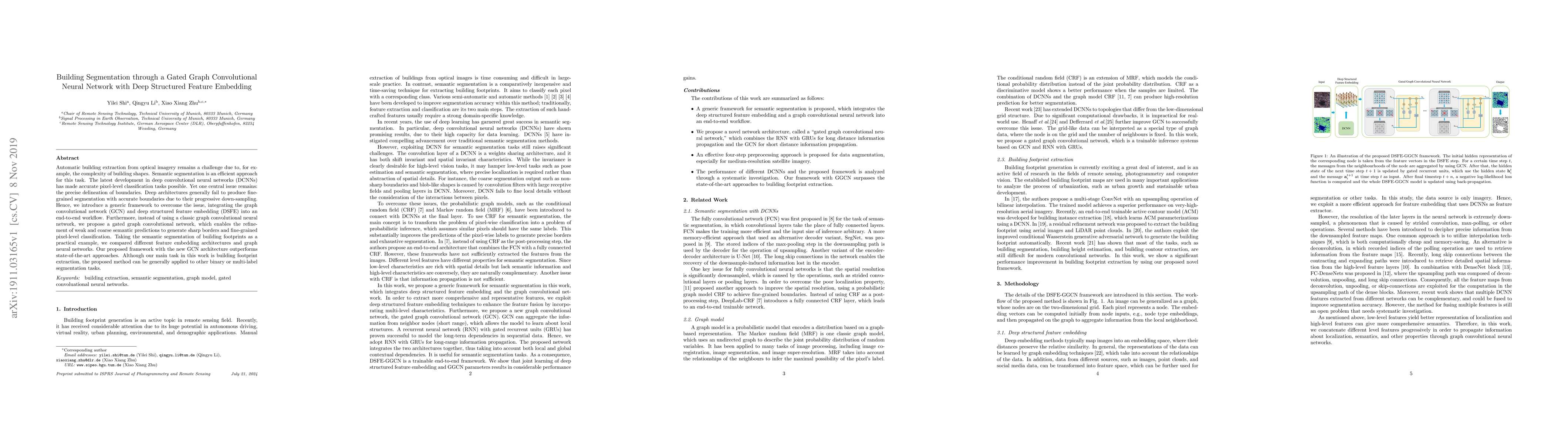 This paper proposes a gated graph convolutional neural network with deep structured feature embedding to achieve precise building segmentation in optical imagery. The new GCN architecture refines coarse predictions to generate sharp boundaries, outperforming existing methods.