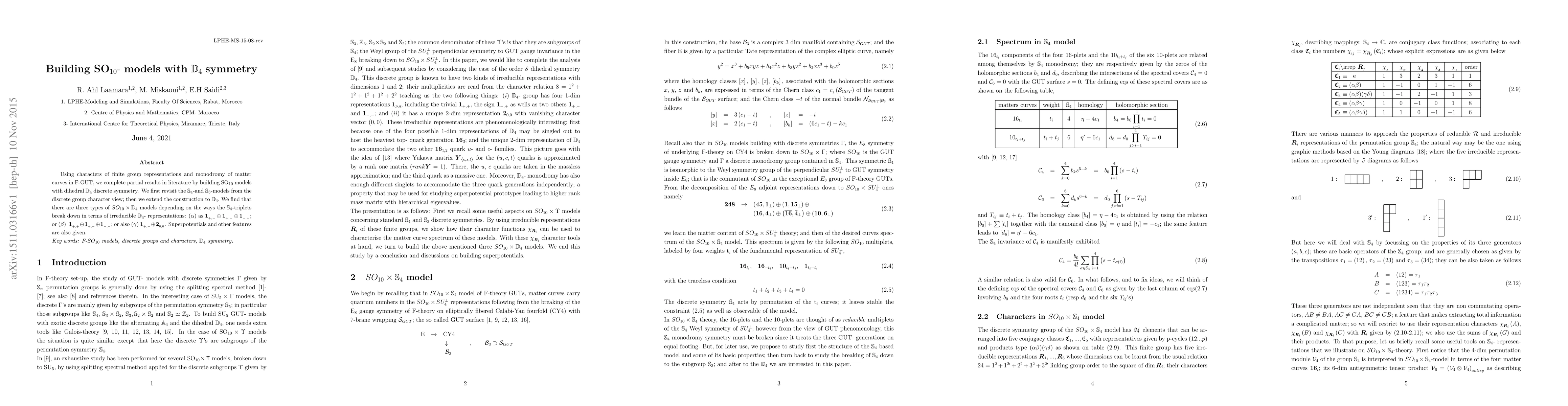Using characters of finite group representations and monodromy of matter curves in F-GUT, we complete partial results in literature by building SO$% _{10}$ models with dihedral $\mathbb{D}_{4}$ discrete symmetry. We first revisit the $\mathbb{S}_{4}$-and $\mathbb{S}_{3}$-models from the discrete group character view, then we extend the construction to $\mathbb{D}_{4}$.\ We find that there are three types of $SO_{10}\times \mathbb{D}_{4}$ models depending on the ways the $\mathbb{S}_{4}$-triplets break down in terms of irreducible $\mathbb{D}_{4}$- representations: $\left({\alpha} \right) $ as $\boldsymbol{1}_{_{+,-}}\oplus \boldsymbol{1}_{_{+,-}}\oplus \boldsymbol{1}_{_{-,+}};$ or $\left({\beta}\right) \boldsymbol{\ 1}_{_{+,+}}\oplus \boldsymbol{1}_{_{+,-}}\oplus \boldsymbol{1}_{_{-,-}};$ or also $\left({\gamma}\right) $ $\mathbf{1}_{_{+,-}}\oplus \mathbf{2}_{_{0,0}}$. Superpotentials and other features are also given.