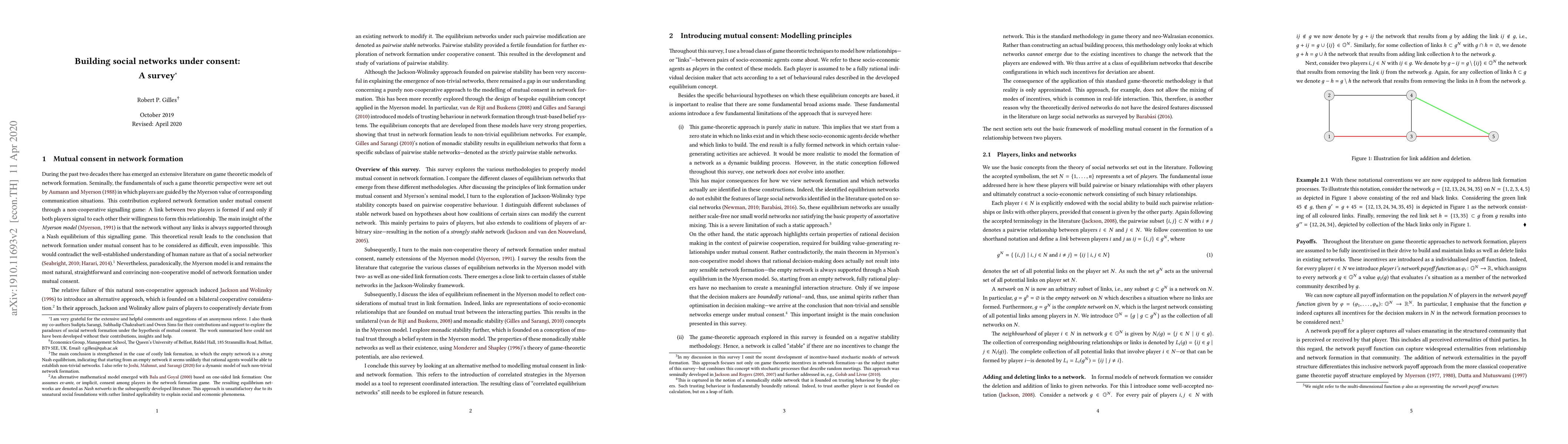 This survey explores the literature on game-theoretic models of network formation under the hypothesis of mutual consent in link formation. The introduction of consent in link formation imposes a coordination problem in the network formation process. This survey explores the conclusions from this theory and the various methodologies to avoid the main pitfalls. The main insight originates from Myerson's work on mutual consent in link formation and his main conclusion that the empty network (the network without any links) always emerges as a strong Nash equilibrium in any game-theoretic model of network formation under mutual consent and positive link formation costs. Jackson and Wolinsky introduced a cooperative framework to avoid this main pitfall. They devised the notion of a pairwise stable network to arrive at equilibrium networks that are mainly non-trivial. Unfortunately, this notion of pairwise stability requires coordinated action by pairs of decision makers in link formation. I survey the possible solutions in a purely non-cooperative framework of network formation under mutual consent by exploring potential refinements of the standard Nash equilibrium concept to explain the emergence of non-trivial networks. This includes the notions of unilateral and monadic stability. The first one is founded on advanced rational reasoning of individuals about how others would respond to one's efforts to modify the network. The latter incorporates trusting, boundedly rational behaviour into the network formation process. The survey is concluded with an initial exploration of external correlation devices as an alternative framework to address mutual consent in network formation.