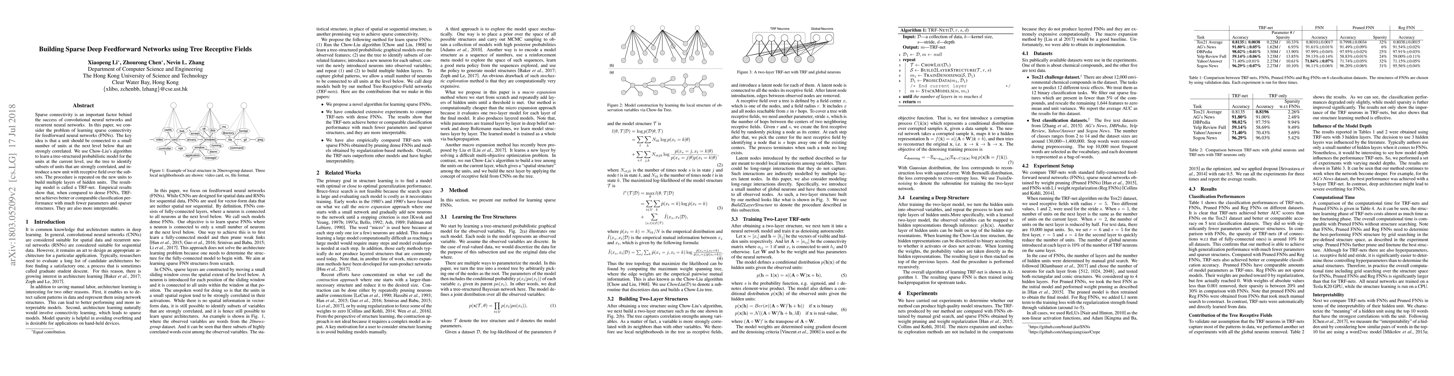 Sparse connectivity is an important factor behind the success of convolutional neural networks and recurrent neural networks. In this paper, we consider the problem of learning sparse connectivity for feedforward neural networks (FNNs). The key idea is that a unit should be connected to a small number of units at the next level below that are strongly correlated. We use Chow-Liu's algorithm to learn a tree-structured probabilistic model for the units at the current level, use the tree to identify subsets of units that are strongly correlated, and introduce a new unit with receptive field over the subsets. The procedure is repeated on the new units to build multiple layers of hidden units. The resulting model is called a TRF-net. Empirical results show that, when compared to dense FNNs, TRF-net achieves better or comparable classification performance with much fewer parameters and sparser structures. They are also more interpretable.