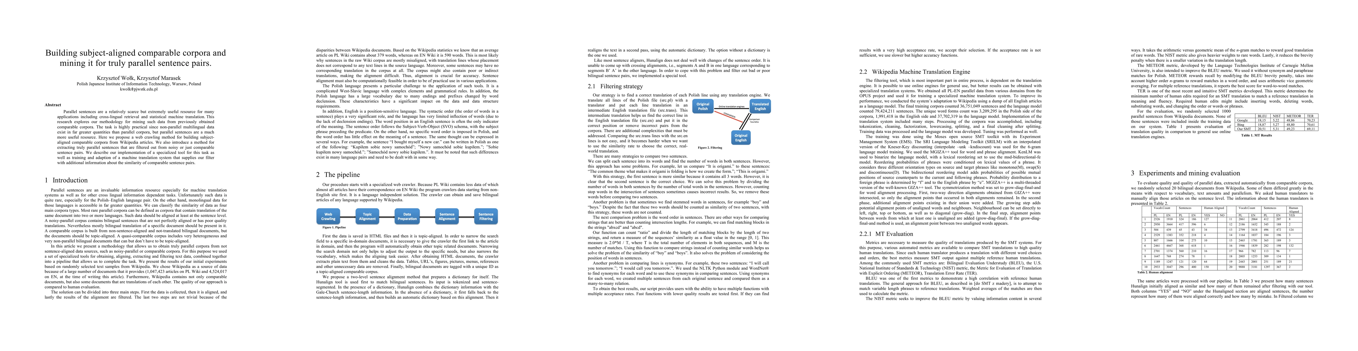 This research develops a method for constructing subject-aligned comparable corpora from Wikipedia and extracts truly parallel sentence pairs from them, using web crawling and a specialized tool, along with machine translation system adaptation to filter out noisy sentence pairs.