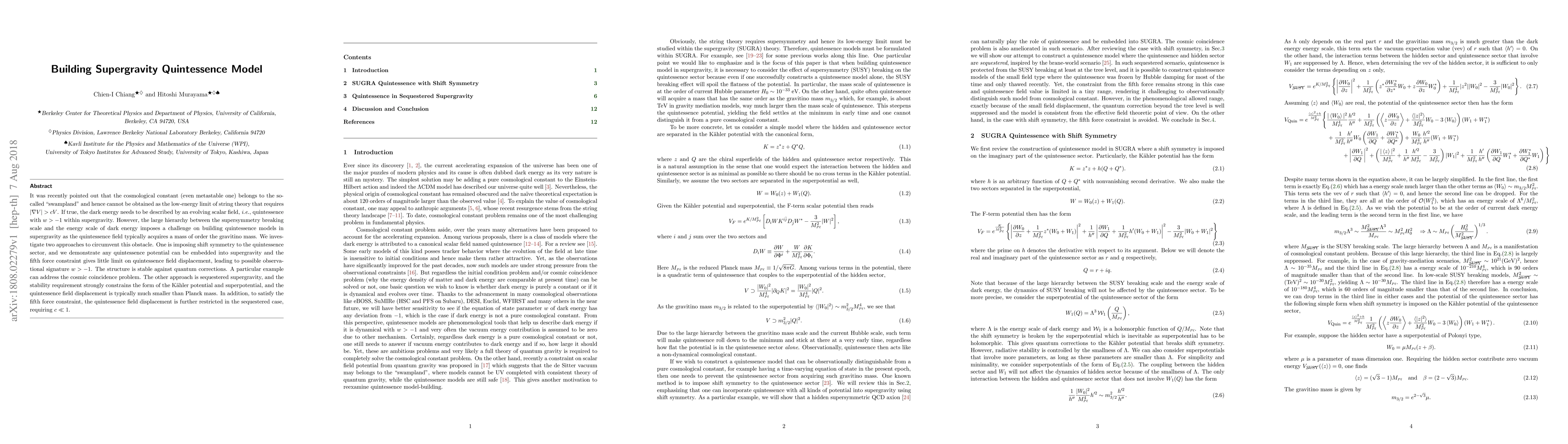 This paper explores methods to construct a supergravity quintessence model that satisfies the constraints of string theory, focusing on two approaches: imposing shift symmetry to embed quintessence potentials and using sequestered supergravity. Both approaches aim to address the hierarchy problem and the challenge of quintessence field mass in supergravity.