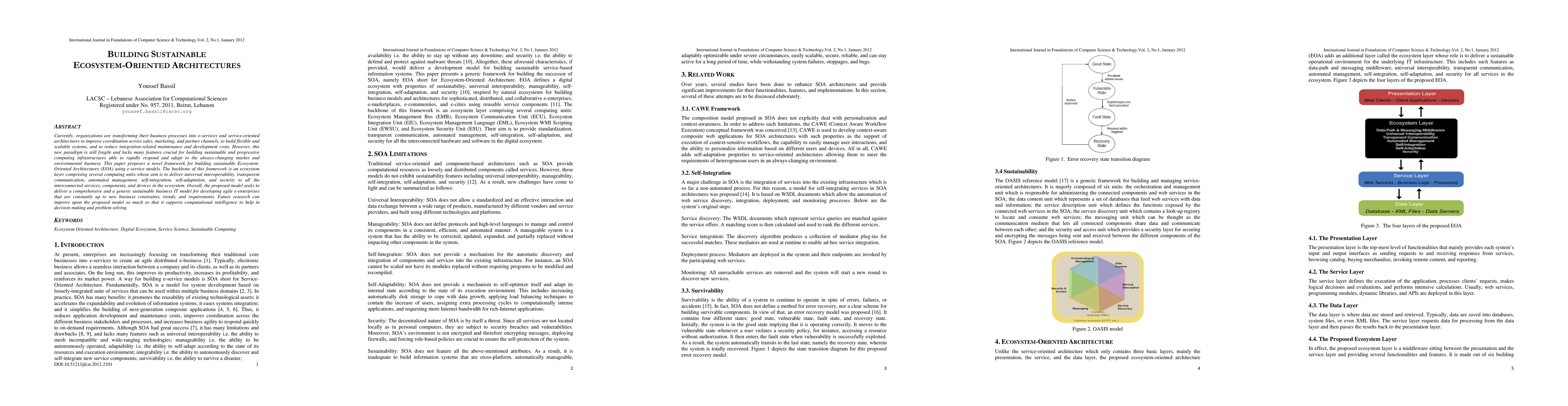 This paper introduces a novel framework for creating sustainable Ecosystem-Oriented Architectures (EOA) using e-service models, emphasizing universal interoperability, automated management, and self-adaptation to meet dynamic business needs. Future enhancements may incorporate computational intelligence for improved decision-making and problem-solving.