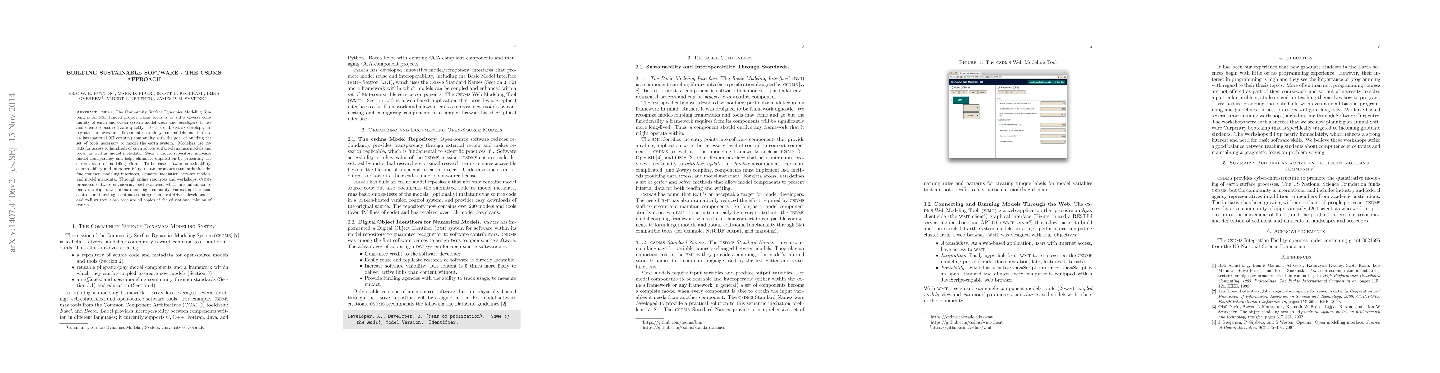 CSDMS, The Community Surface Dynamics Modeling System, is an NSF funded project whose focus is to aid a diverse community of earth and ocean system model users and developers to use and create robust software quickly. To this end, CSDMS develops, integrates, archives and disseminates earth-system models and tools to an international (67 country) community with the goal of building the set of tools necessary to model the earth system. Modelers use CSDMS for access to hundreds of open source surface-dynamics models and tools, as well as model metadata. Such a model repository increases model transparency and helps eliminate duplication by presenting the current state of modeling efforts. To increase software sustainability, composability and interoperability, CSDMS promotes standards that define common modeling interfaces, semantic mediation between models, and model metadata. Through online resources and workshops, CSDMS promotes software engineering best practices, which are unfamiliar to many developers within our modeling community. For example, version control, unit testing, continuous integration, test-driven development, and well-written clean code are all topics of the educational mission of CSDMS.