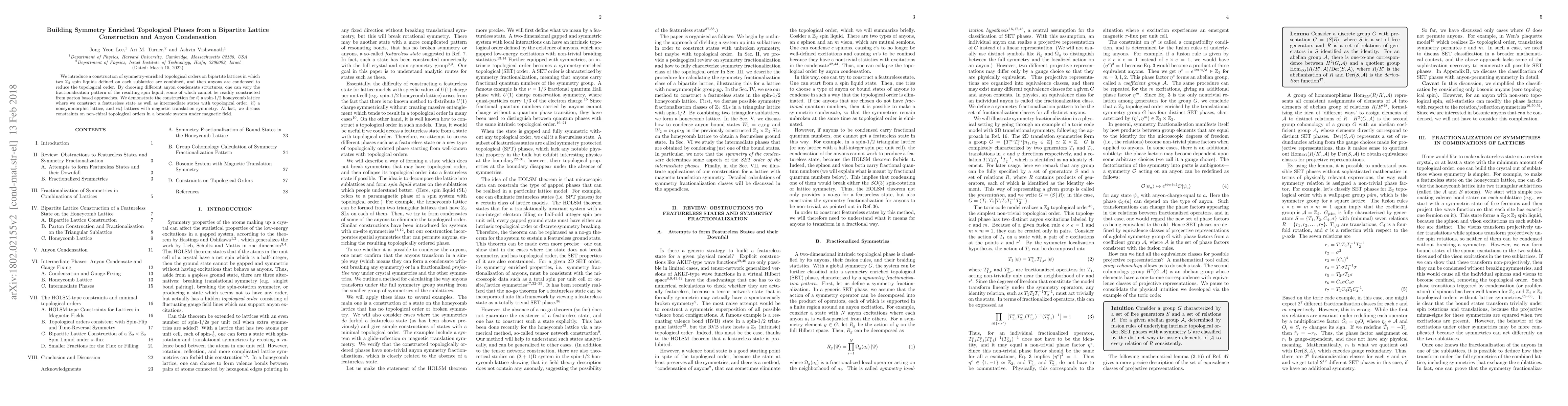 This paper constructs symmetry-enriched topological orders on bipartite lattices by combining $\mathbb{Z}_2$ spin liquids and condensing anyons to alter fractionalization patterns. It demonstrates the method on spin-1/2 honeycomb, nonsymmorphic, and magnetic translation symmetric lattices, highlighting states unattainable via parton-based approaches.