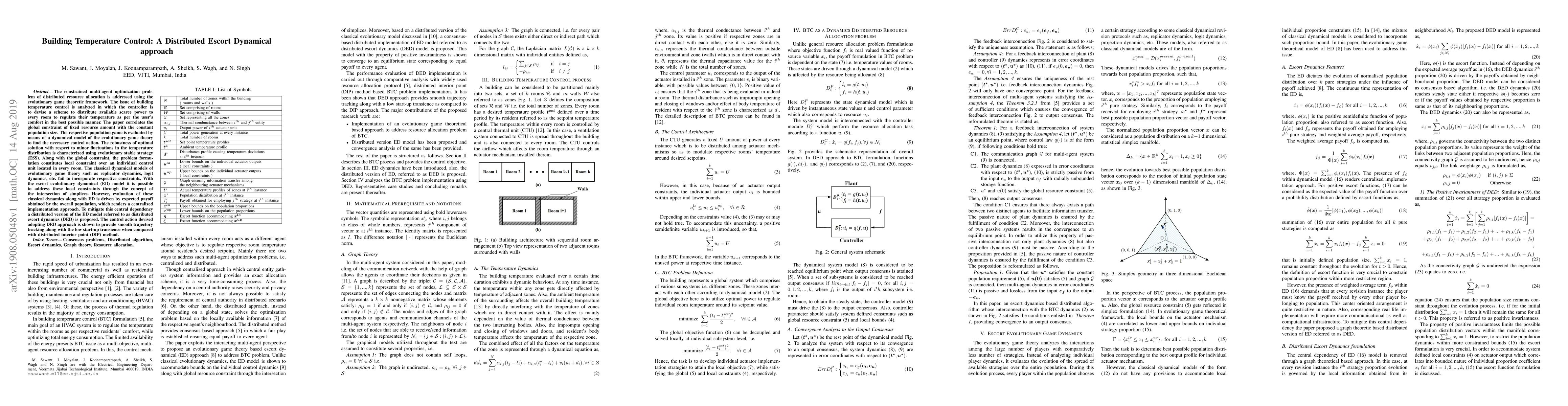 The constrained multi-agent optimization problem of distributed resource allocation is addressed using the evolutionary game theoretic framework. The issue of building temperature control is analyzed in which the controller is to devise a scheme to distribute available scarce power to every room to regulate their temperature as per the comfort of user in the best possible manner. The paper correlates the global constraint of fixed resource amount with the constant population size. The respective population game is evaluated by means of a dynamical model of the evolutionary game theory to find the necessary control action. The robustness of optimal solution with respect to minor fluctuations in the temperature distribution is characterized using evolutionary stable strategy ( ESS ). Along with the global constraint, the problem formulation constitutes local constraint over an individual control unit located in every room. The classical dynamical models of evolutionary game theory such as replicator dynamics, logit dynamics, etc. fail to incorporate respective constraints. With the escort evolutionary dynamical (ED) model it is possible to address these local constraints through the concept of the intersection of simplices. However, evaluation of these classical dynamics along with ED is driven by expected payoff obtained by the overall population, which renders a centralized implementation approach. To mitigate this central dependency a distributed version of the ED model referred to as distributed escort dynamics (DED) is proposed. The control action devised adopting DED approach is shown to provide smooth trajectory tracking along with the low start-up transience when compared with distributed interior point (DIP) method.