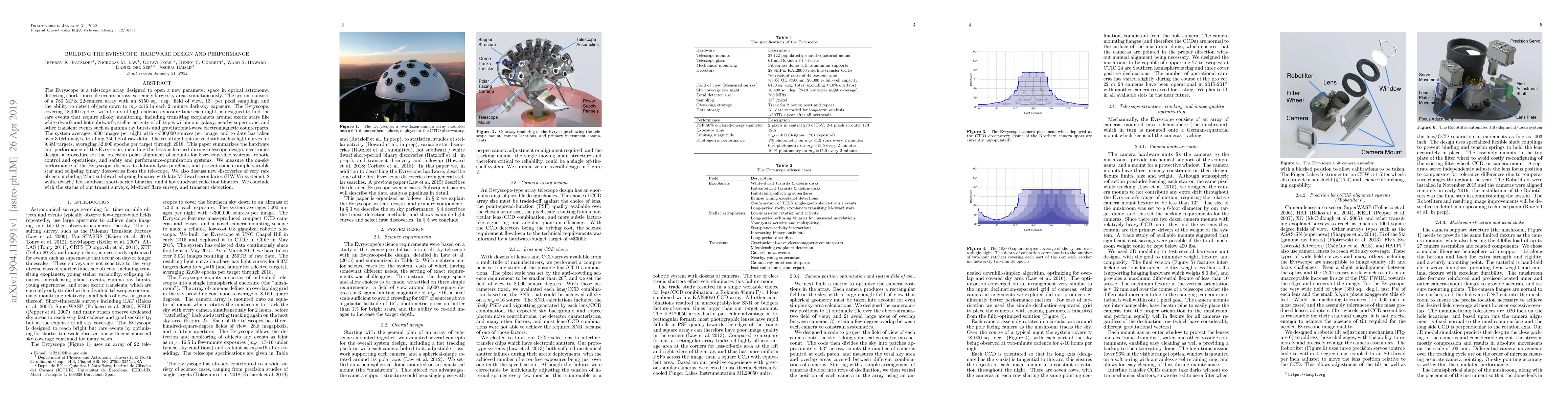 This paper details the hardware design and performance of the Evryscope telescope array, which uses a 22-camera setup to monitor vast sky areas for transient astronomical events. It highlights the system's achievements in detecting rare phenomena and presents insights from its operational and data analysis pipelines, including notable discoveries of variable stars and eclipsing binaries.