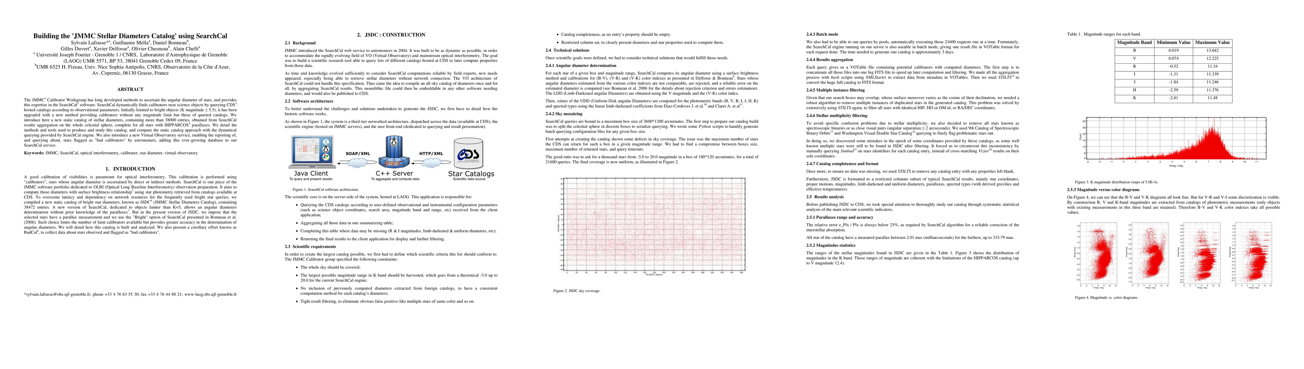 The JMMC Stellar Diameters Catalog, containing over 38,000 entries, has been created using SearchCal software, which dynamically finds calibrators near science objects. This static catalog is complete for all stars with HIPPARCOS parallaxes, and a new Virtual Observatory service reports and queries 'bad calibrators' identified by astronomers, expanding the SearchCal service.