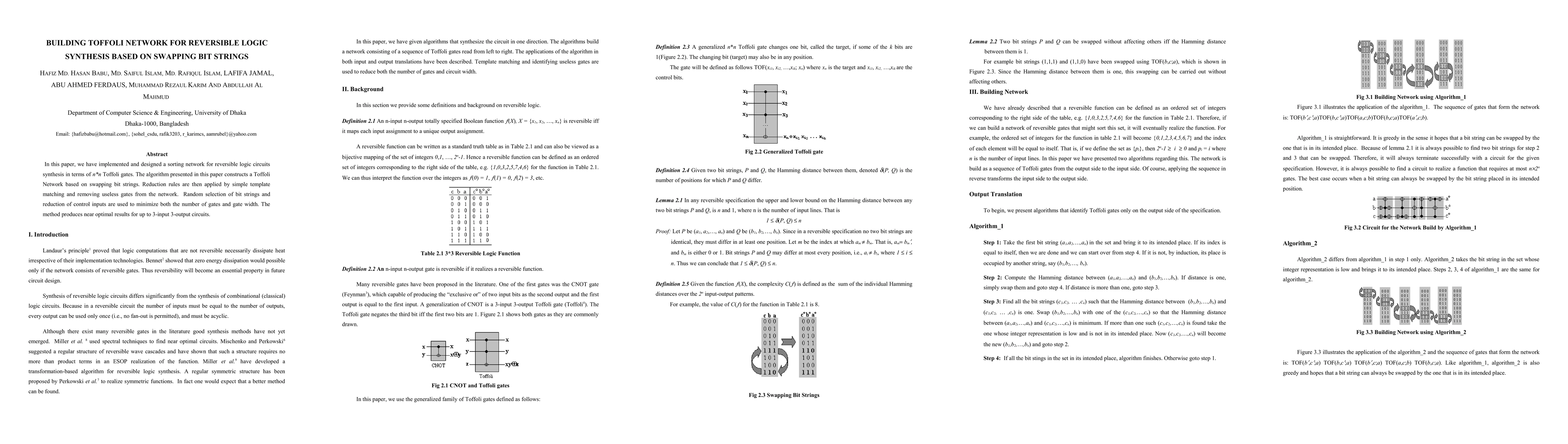 This paper presents an algorithm for constructing a Toffoli network for reversible logic synthesis by swapping bit strings, employing reduction rules and minimizing gate count and width to achieve near-optimal results for up to 3-input 3-output circuits. The method utilizes template matching and random selection to optimize the network.