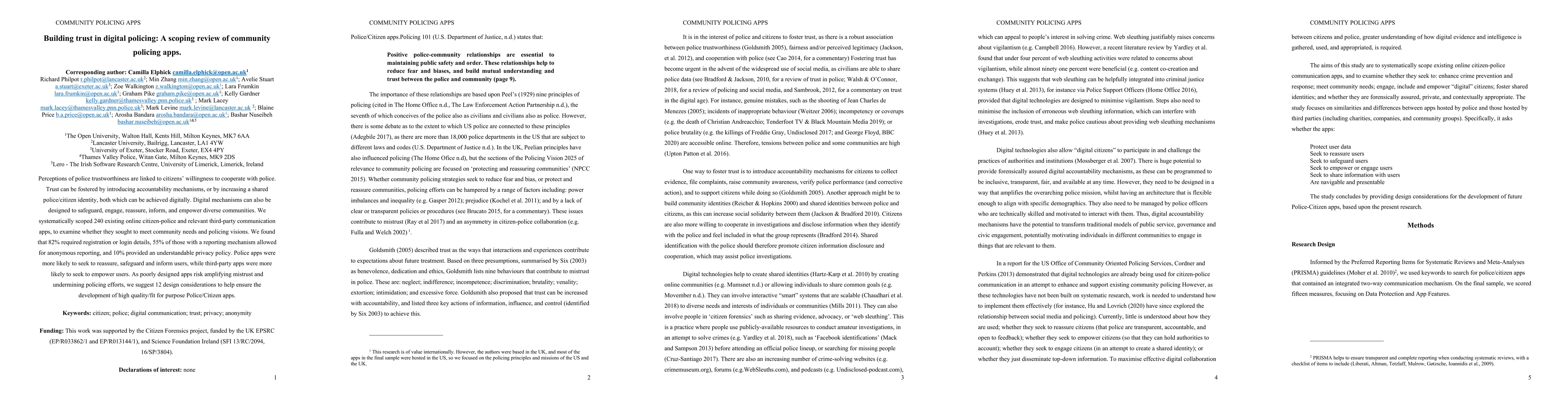 A scoping review of 240 community policing apps found that many lack essential features like anonymity and clear privacy policies, potentially undermining trust between police and citizens. The study suggests 12 design considerations to improve the development of effective and trustworthy Police/Citizen apps.
