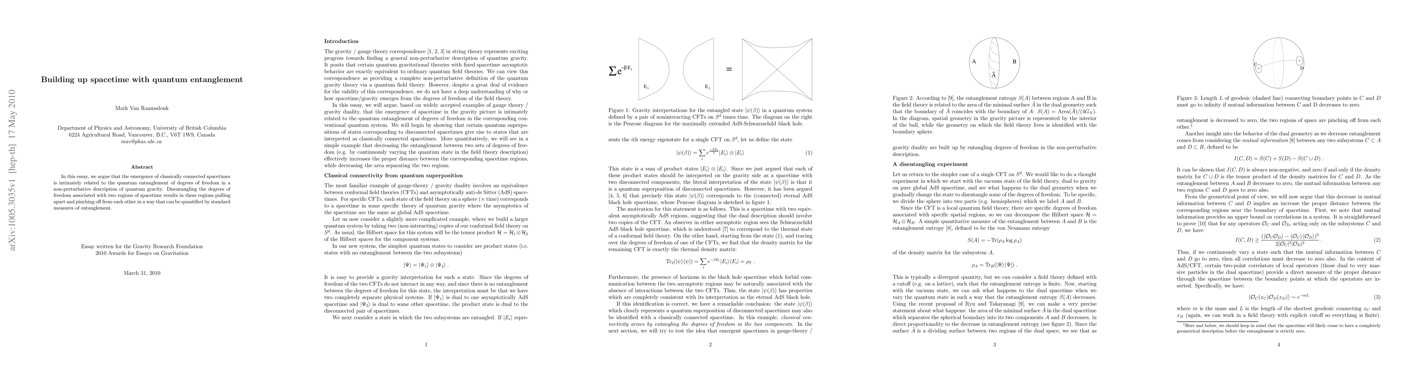 In this essay, we argue that the emergence of classically connected spacetimes is intimately related to the quantum entanglement of degrees of freedom in a non-perturbative description of quantum gravity. Disentangling the degrees of freedom associated with two regions of spacetime results in these regions pulling apart and pinching off from each other in a way that can be quantified by standard measures of entanglement.