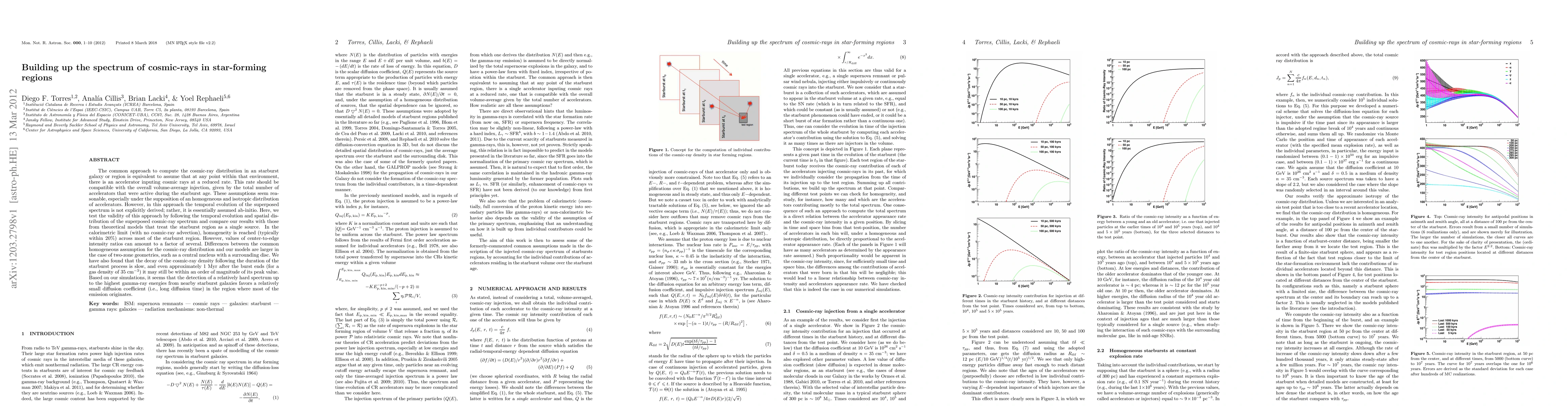 The common approach to compute the cosmic-ray distribution in an starburst galaxy or region is equivalent to assume that at any point within that environment, there is an accelerator inputing cosmic rays at a reduced rate. This rate should be compatible with the overall volume-average injection, given by the total number of accelerators that were active during the starburst age. These assumptions seem reasonable, especially under the supposition of an homogeneous and isotropic distribution of accelerators. However, in this approach the temporal evolution of the superposed spectrum is not explicitly derived; rather, it is essentially assumed ab-initio. Here, we test the validity of this approach by following the temporal evolution and spatial distribution of the superposed cosmic-ray spectrum and compare our results with those from theoretical models that treat the starburst region as a single source. In the calorimetric limit (with no cosmic-ray advection), homogeneity is reached (typically within 20%) across most of the starburst region. However, values of center-to-edge intensity ratios can amount to a factor of several. Differences between the common homogeneous assumption for the cosmic-ray distribution and our models are larger in the case of two-zone geometries, such as a central nucleus with a surrounding disc. We have also found that the decay of the cosmic-ray density following the duration of the starburst process is slow, and even approximately 1 Myr after the burst ends (for a gas density of 35 cm-3) it may still be within an order of magnitude of its peak value. Based on our simulations, it seems that the detection of a relatively hard spectrum up to the highest gamma-ray energies from nearby starburst galaxies favors a relatively small diffusion coefficient (i.e., long diffusion time) in the region where most of the emission originates.