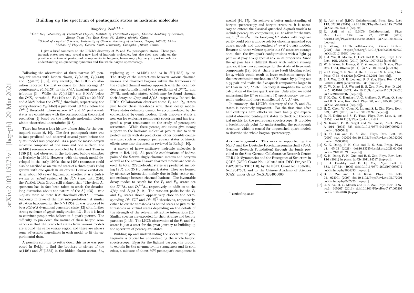 I give a brief comment on the LHCb's discovery of $P_c$ and $P_{cs}$ pentaquark states. These pentaquark states not only reveal a new kind of hadronic molecules, but also shed new light on the possible structure of pentaquark components in baryons, hence may play very important role for understanding un-quenching dynamics and the whole baryon spectroscopy.