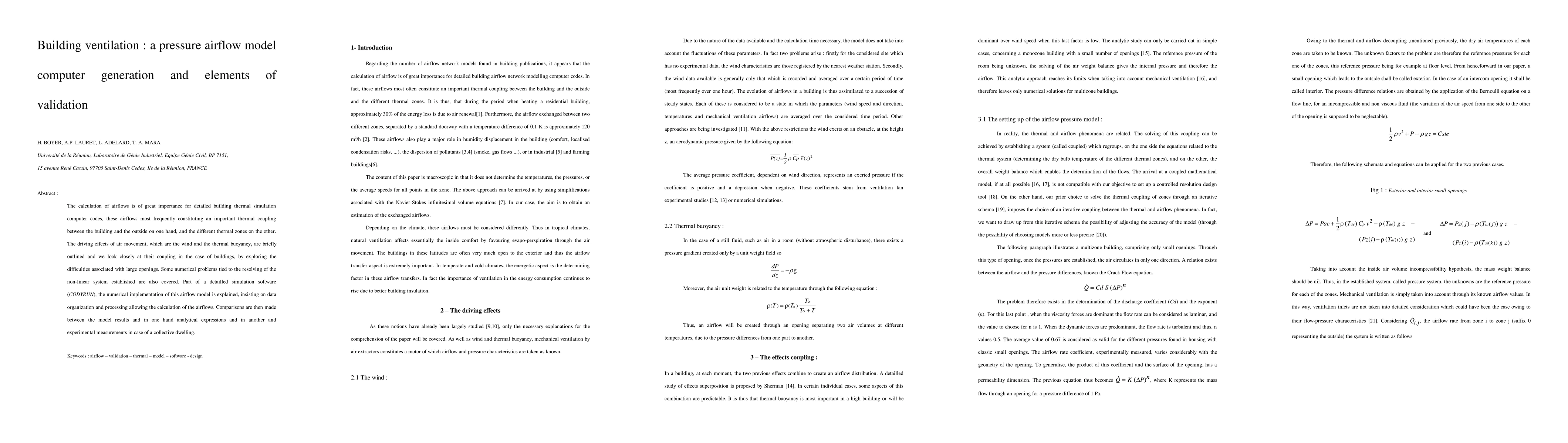 This paper develops a pressure airflow model for building ventilation, focusing on the coupling effects of wind and thermal buoyancy. It details the numerical implementation within the CODYRUN simulation software, and validates the model through comparisons with analytical expressions and experimental measurements in a collective dwelling.