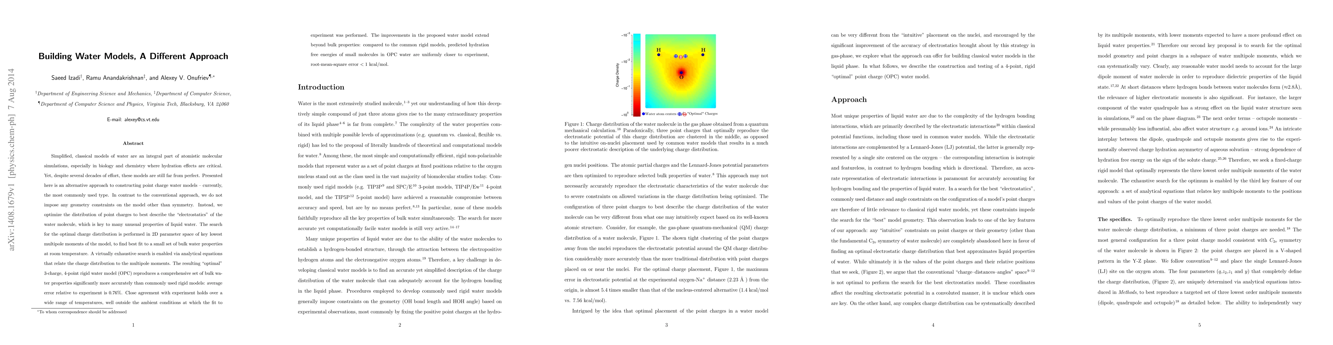Simplified, classical models of water are an integral part of atomistic molecular simulations, especially in biology and chemistry where hydration effects are critical. Yet, despite several decades of effort, these models are still far from perfect. Presented here is an alternative approach to constructing point charge water models - currently, the most commonly used type. In contrast to the conventional approach, we do not impose any geometry constraints on the model other than symmetry. Instead, we optimize the distribution of point charges to best describe the "electrostatics" of the water molecule, which is key to many unusual properties of liquid water. The search for the optimal charge distribution is performed in 2D parameter space of key lowest multipole moments of the model, to find best fit to a small set of bulk water properties at room temperature. A virtually exhaustive search is enabled via analytical equations that relate the charge distribution to the multipole moments. The resulting "optimal" 3-charge, 4-point rigid water model (OPC) reproduces a comprehensive set of bulk water properties significantly more accurately than commonly used rigid models: average error relative to experiment is 0.76%. Close agreement with experiment holds over a wide range of temperatures, well outside the ambient conditions at which the fit to experiment was performed. The improvements in the proposed water model extend beyond bulk properties: compared to the common rigid models, predicted hydration free energies of small molecules in OPC water are uniformly closer to experiment, root-mean-square error < 1kcal/mol.
