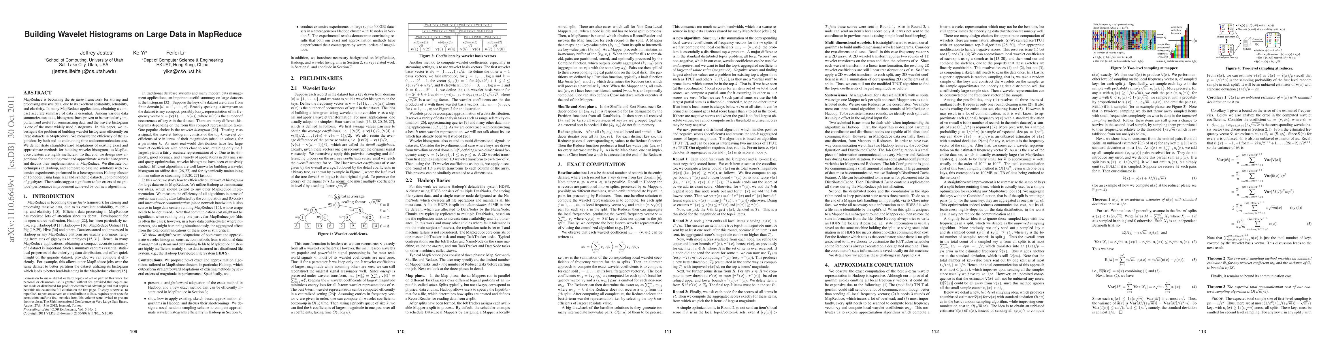 This paper proposes new algorithms for efficiently building wavelet histograms on large datasets using MapReduce, demonstrating significant performance improvements over existing methods through extensive experiments in a Hadoop cluster. The new algorithms address the inefficiency of adapting traditional methods to MapReduce environments.