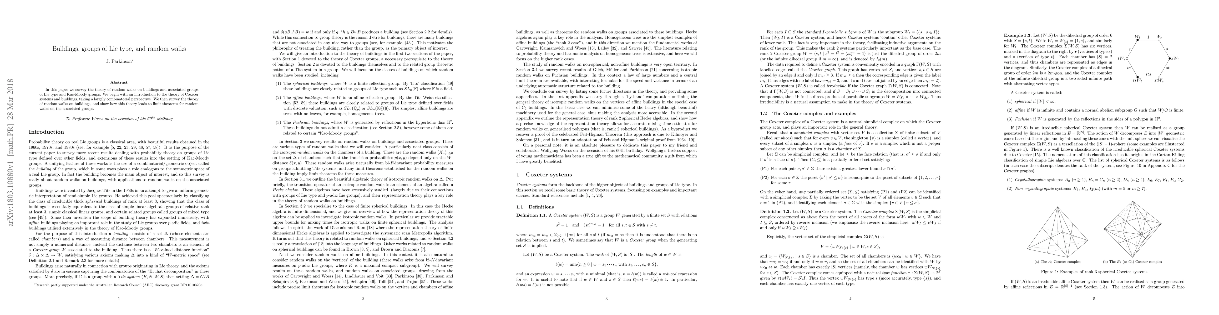 This paper surveys random walks on buildings and associated groups of Lie type, starting with an introduction to Coxeter systems and buildings from a combinatorial viewpoint, followed by a discussion on the theory and limit theorems of these random walks.