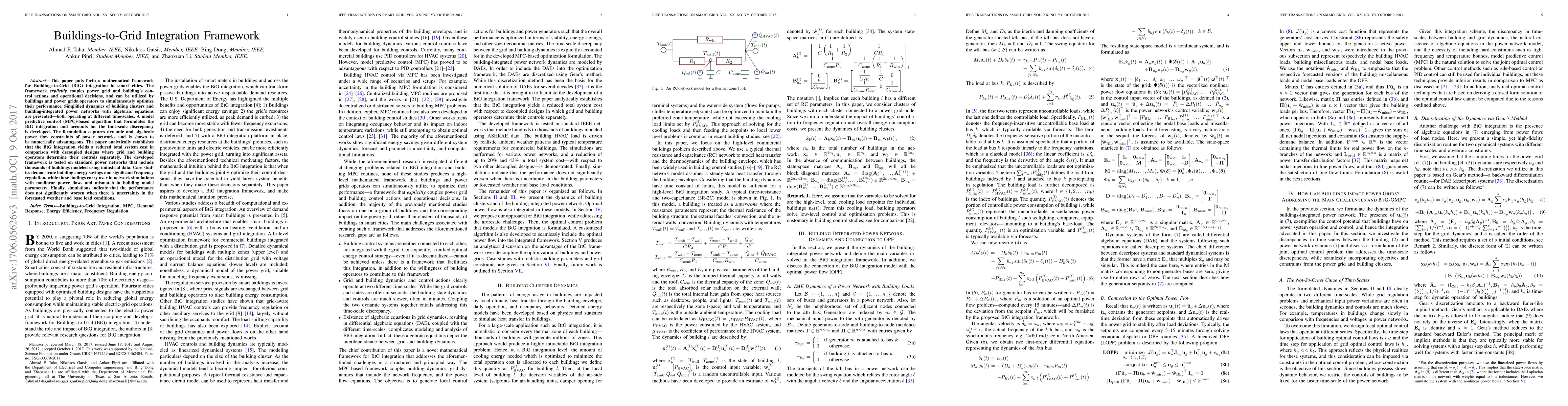This paper puts forth a mathematical framework for Buildings-to-Grid (BtG) integration in smart cities. The framework explicitly couples power grid and building's control actions and operational decisions, and can be utilized by buildings and power grids operators to simultaneously optimize their performance. Simplified dynamics of building clusters and building-integrated power networks with algebraic equations are presented---both operating at different time-scales. A model predictive control (MPC)-based algorithm that formulates the BtG integration and accounts for the time-scale discrepancy is developed. The formulation captures dynamic and algebraic power flow constraints of power networks and is shown to be numerically advantageous. The paper analytically establishes that the BtG integration yields a reduced total system cost in comparison with decoupled designs where grid and building operators determine their controls separately. The developed framework is tested on standard power networks that include thousands of buildings modeled using industrial data. Case studies demonstrate building energy savings and significant frequency regulation, while these findings carry over in network simulations with nonlinear power flows and mismatch in building model parameters. Finally, simulations indicate that the performance does not significantly worsen when there is uncertainty in the forecasted weather and base load conditions.