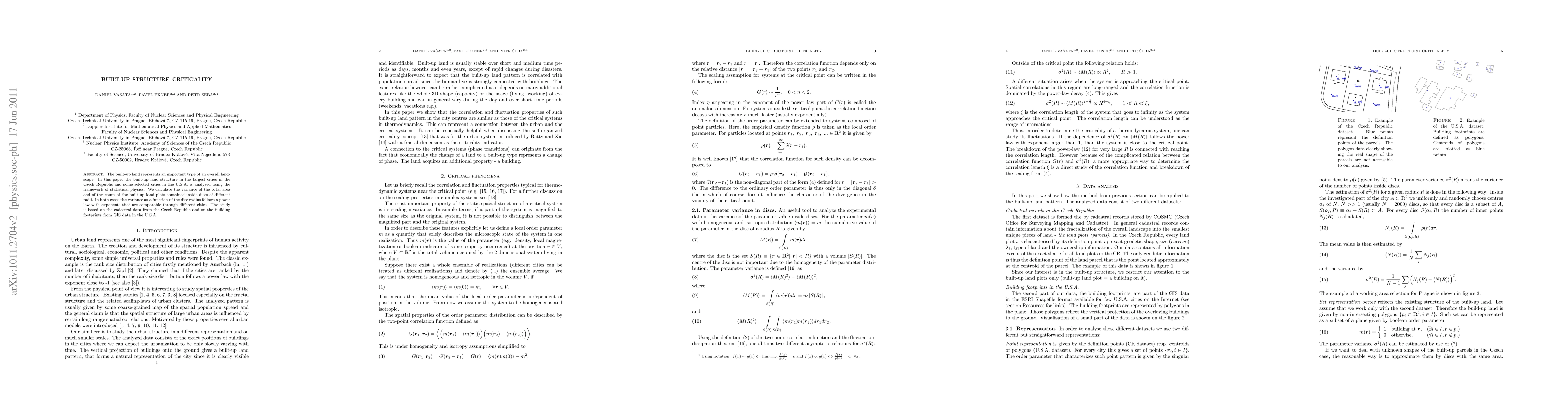 The built-up land represents an important type of overall landscape. In this paper the built-up land structure in the largest cities in the Czech Republic and selected cities in the U.S.A. is analysed using the framework of statistical physics. We calculate the variance of the built-up area and the number variance of built-up landed plots in discs. In both cases the variance as a function of a disc radius follows a power law. The obtained values of power law exponents are comparable through different cities. The study is based on cadastral data from the Czech Republic and building footprints from GIS data in the U.S.A.