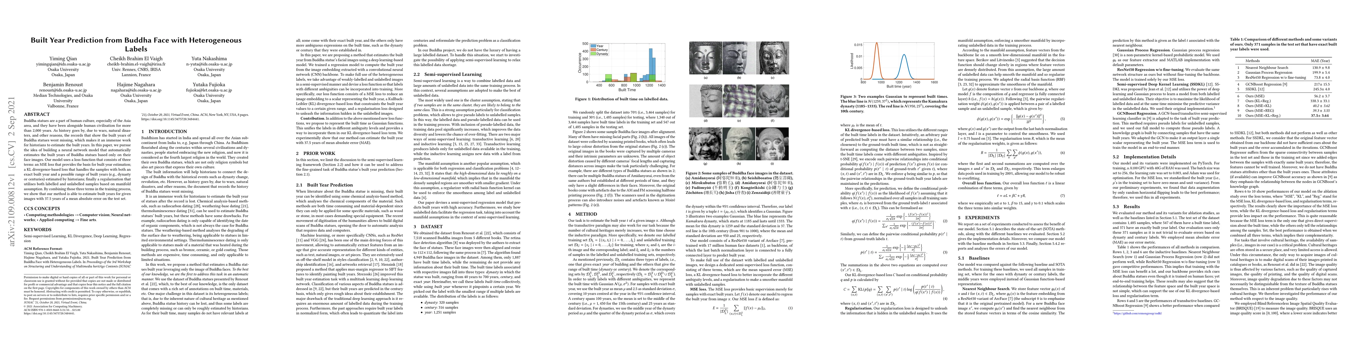Buddha statues are a part of human culture, especially of the Asia area, and they have been alongside human civilisation for more than 2,000 years. As history goes by, due to wars, natural disasters, and other reasons, the records that show the built years of Buddha statues went missing, which makes it an immense work for historians to estimate the built years. In this paper, we pursue the idea of building a neural network model that automatically estimates the built years of Buddha statues based only on their face images. Our model uses a loss function that consists of three terms: an MSE loss that provides the basis for built year estimation; a KL divergence-based loss that handles the samples with both an exact built year and a possible range of built years (e.g., dynasty or centuries) estimated by historians; finally a regularisation that utilises both labelled and unlabelled samples based on manifold assumption. By combining those three terms in the training process, we show that our method is able to estimate built years for given images with 37.5 years of a mean absolute error on the test set.