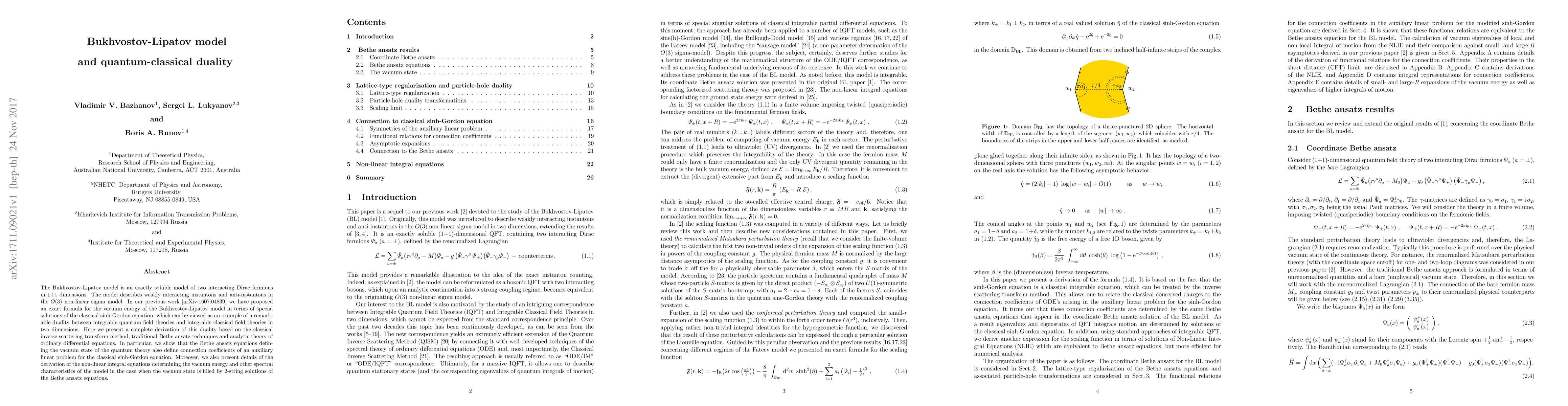The Bukhvostov-Lipatov model is an exactly soluble model of two interacting Dirac fermions in 1+1 dimensions. The model describes weakly interacting instantons and anti-instantons in the $O(3)$ non-linear sigma model. In our previous work [arXiv:1607.04839] we have proposed an exact formula for the vacuum energy of the Bukhvostov-Lipatov model in terms of special solutions of the classical sinh-Gordon equation, which can be viewed as an example of a remarkable duality between integrable quantum field theories and integrable classical field theories in two dimensions. Here we present a complete derivation of this duality based on the classical inverse scattering transform method, traditional Bethe ansatz techniques and analytic theory of ordinary differential equations. In particular, we show that the Bethe ansatz equations defining the vacuum state of the quantum theory also define connection coefficients of an auxiliary linear problem for the classical sinh-Gordon equation. Moreover, we also present details of the derivation of the non-linear integral equations determining the vacuum energy and other spectral characteristics of the model in the case when the vacuum state is filled by 2-string solutions of the Bethe ansatz equations.