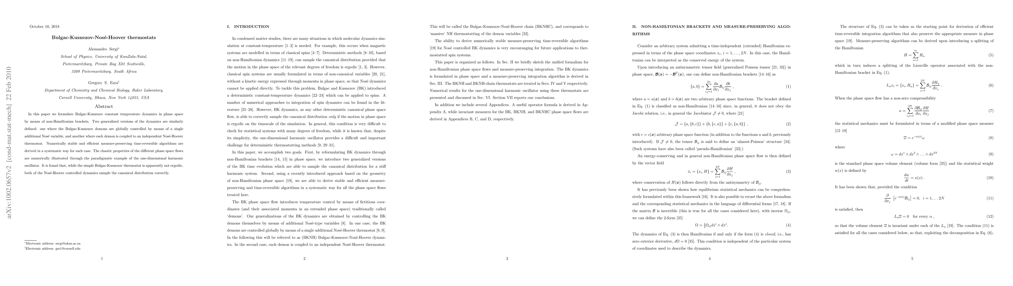 In this paper we formulate Bulgac-Kusnezov constant temperature dynamics in phase space by means of non-Hamiltonian brackets. Two generalized versions of the dynamics are similarly defined: one where the Bulgac-Kusnezov demons are globally controlled by means of a single additional Nos\'e variable, and another where each demon is coupled to an independent Nos\'e-Hoover thermostat. Numerically stable and efficient measure-preserving time-reversible algorithms are derived in a systematic way for each case. The chaotic properties of the different phase space flows are numerically illustrated through the paradigmatic example of the one-dimensional harmonic oscillator. It is found that, while the simple Bulgac-Kusnezov thermostat is apparently not ergodic, both of the Nos\'e-Hoover controlled dynamics sample the canonical distribution correctly.