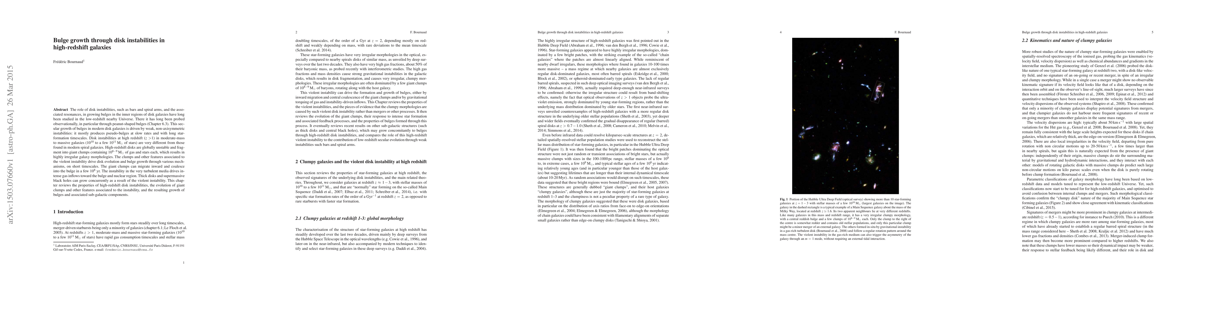 This paper reviews how disk instabilities in high-redshift galaxies, characterized by global fragmentation and giant clumps, rapidly drive the formation of bulges through intense gas inflows and clump coalescence, contrasting with the slower, secular bulge growth seen in low-redshift galaxies.