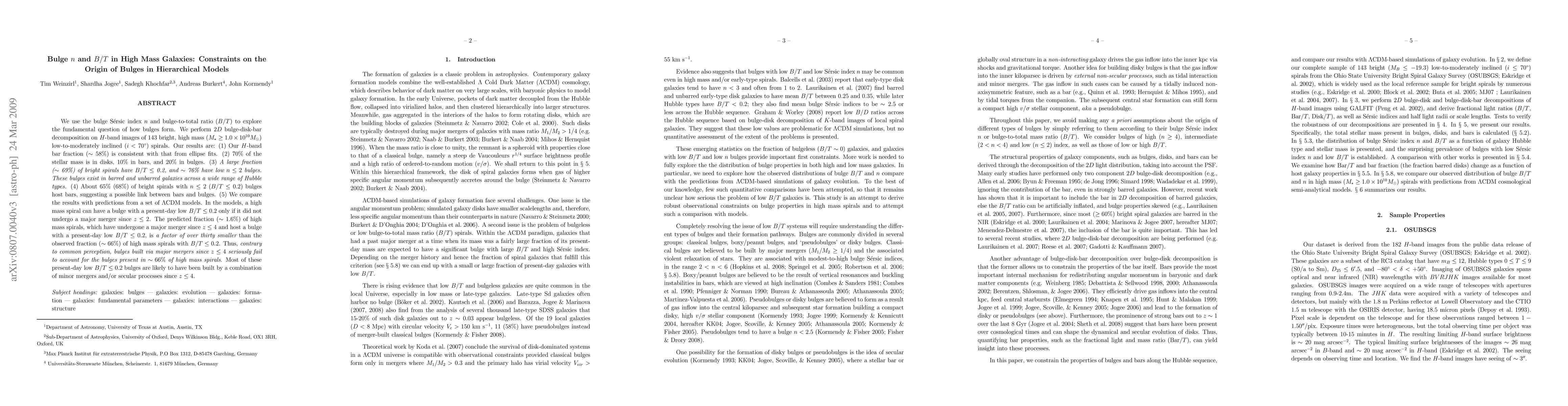 We use the bulge Sersic index n and bulge-to-total ratio (B/T) to explore the fundamental question of how bulges form. We perform 2D bulge-disk-bar decomposition on H-band images of 143 bright, high stellar mass (>1.0e10 solar masses) low-to-moderately inclined (i<70 degrees) spirals. Our results are: (1) Our H-band bar fraction (~58%) is consistent with that from ellipse fits. (2) 70% of the stellar mass is in disks, 10% in bars, and 20% in bulges. (3) A large fraction (~69%) of bright spirals have B/T<0.2, and ~76% have low n<2 bulges. These bulges exist in barred and unbarred galaxies across a wide range of Hubble types. (4) About 65% (68%) of bright spirals with n<2 (B/T<0.2) bulges host bars, suggesting a possible link between bars and bulges. (5) We compare the results with predictions from a set of LCDM models. In the models, a high mass spiral can have a bulge with a present-day low B/T<0.2 only if it did not undergo a major merger since z<2. The predicted fraction (~1.6%) of high mass spirals, which have undergone a major merger since z<4 and host a bulge with a present-day low B/T<0.2, is a factor of over thirty smaller than the observed fraction (~66%) of high mass spirals with B/T<0.2. Thus, contrary to common perception, bulges built via major mergers since z<4 seriously fail to account for the bulges present in ~66% of high mass spirals. Most of these present-day low B/T<0.2 bulges are likely to have been built by a combination of minor mergers and/or secular processes since z<4.