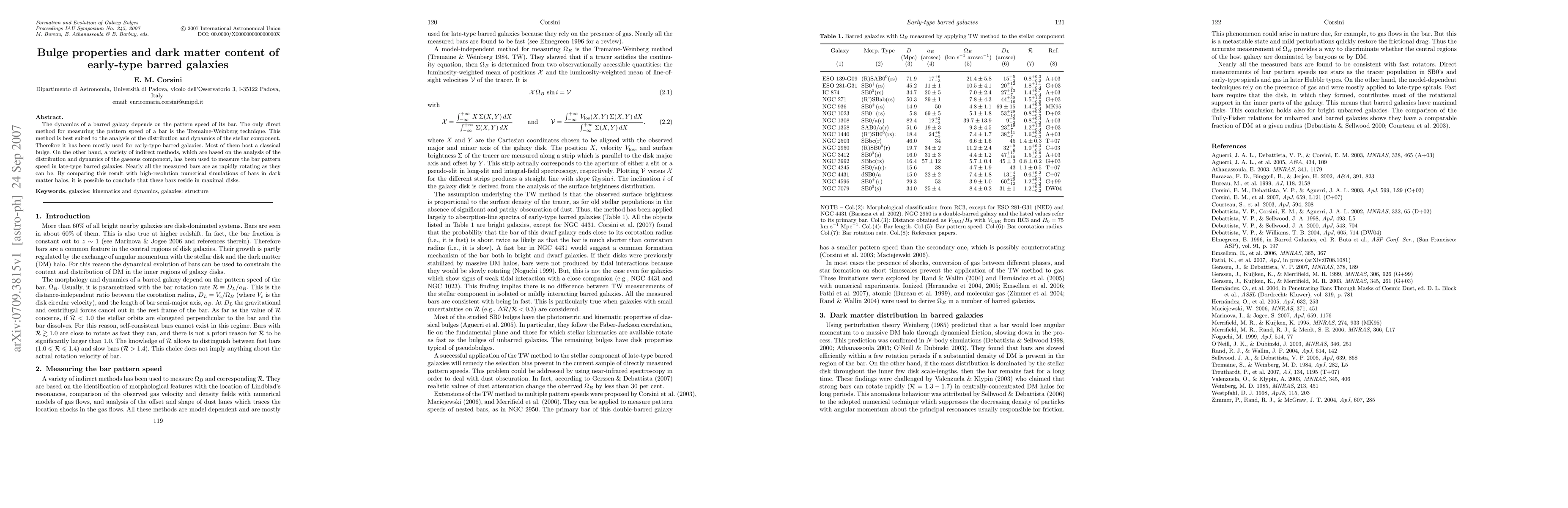 This paper investigates the dynamics of early-type barred galaxies using the Tremaine-Weinberg technique to measure bar pattern speeds, revealing that most bars rotate rapidly and likely reside in maximal disks. The study also explores the relationship between the bulge properties and dark matter content in these galaxies.