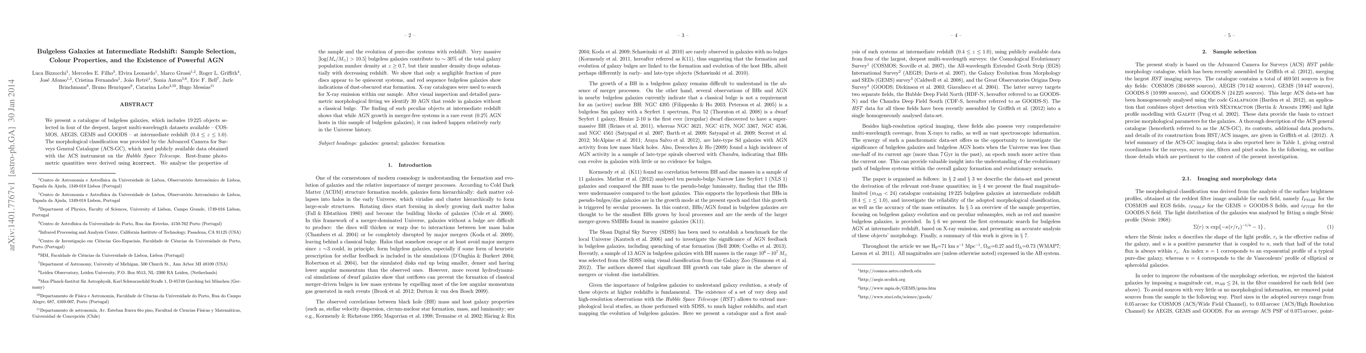 We present a catalogue of bulgeless galaxies, which includes 19225 objects selected in four of the deepest, largest multi-wavelength datasets available -- COSMOS, AEGIS, GEMS and GOODS -- at intermediate redshift ($0.4 \leq z \leq 1.0$). The morphological classification was provided by the Advanced Camera for Surveys General Catalogue (ACS-GC), which used publicly available data obtained with the ACS instrument on the Hubble Space Telescope. Rest-frame photometric quantities were derived using kcorrect. We analyse the properties of the sample and the evolution of pure-disc systems with redshift. Very massive [$\log (M_\star/M_{\odot}) > 10.5$] bulgeless galaxies contribute to ~30% of the total galaxy population number density at $z \geq 0.7$, but their number density drops substantially with decreasing redshift. We show that only a negligible fraction of pure discs appear to be quiescent systems, and red sequence bulgeless galaxies show indications of dust-obscured star formation. X-ray catalogues were used to search for X-ray emission within our sample. After visual inspection and detailed parametric morphological fitting we identify 30 AGN that reside in galaxies without a classical bulge. The finding of such peculiar objects at intermediate redshift shows that while AGN growth in merger-free systems is a rare event (0.2% AGN hosts in this sample of bulgeless galaxies), it can indeed happen relatively early in the Universe history.